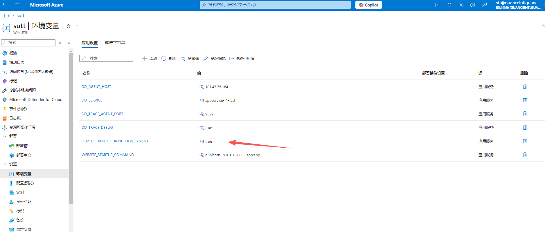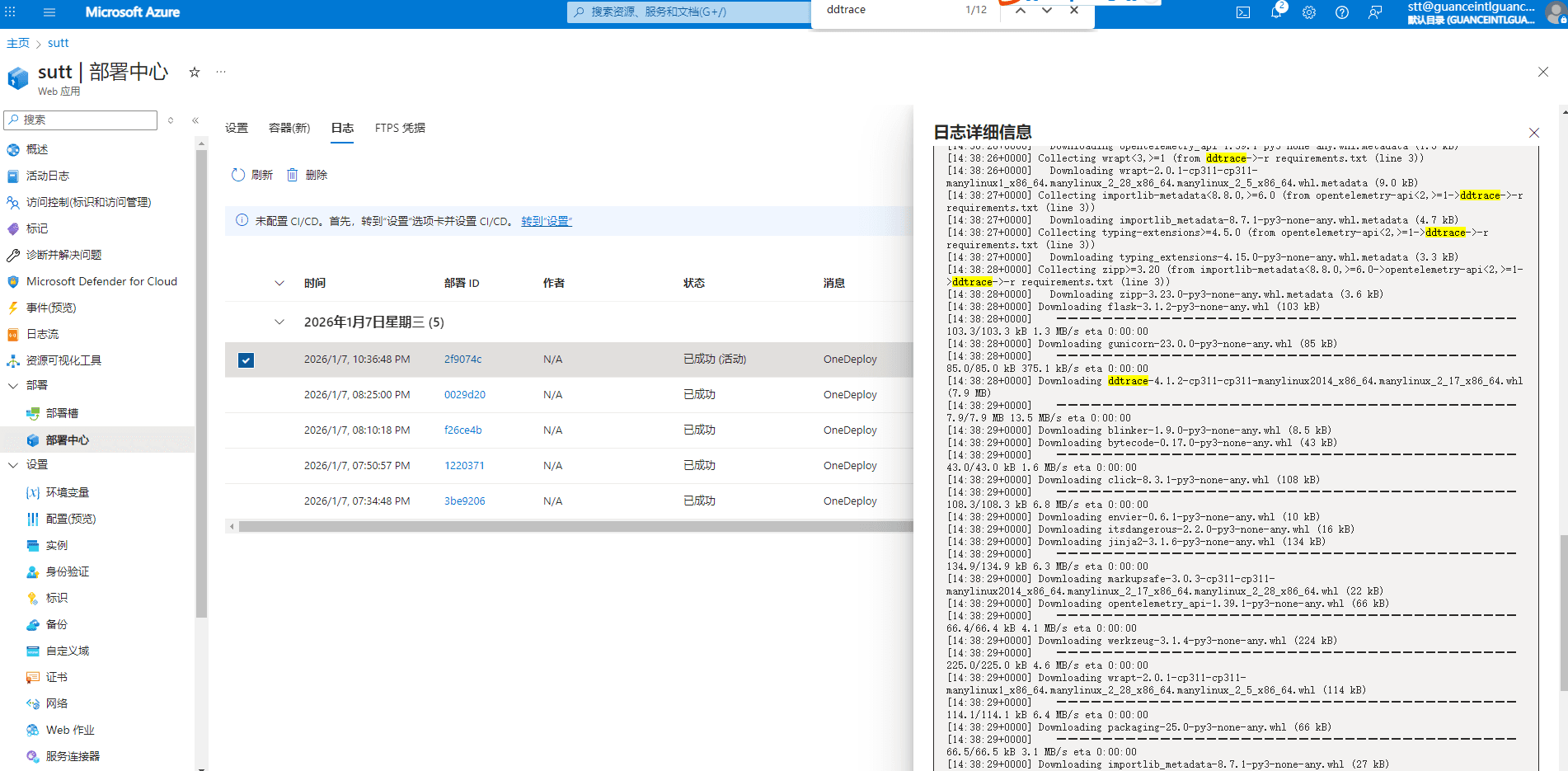 - 关键点:DDTrace 必须在 App Service 的 Python 虚拟环境中安装成功