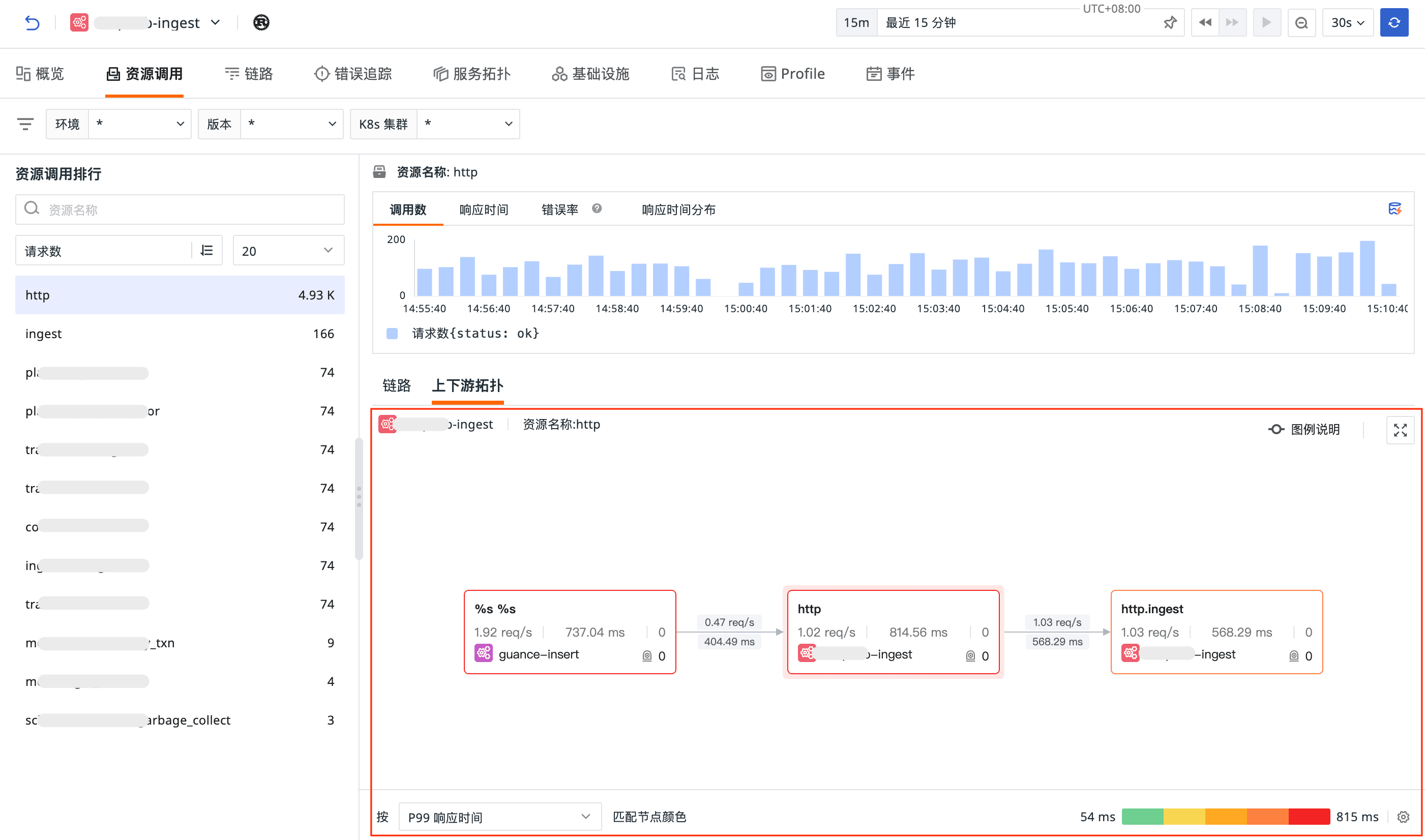 - 进入「应用性能监测 > 服务详情 > 资源调用 > 上下游调用」,选择任意服务节点立即开始您的拓扑探索之旅。