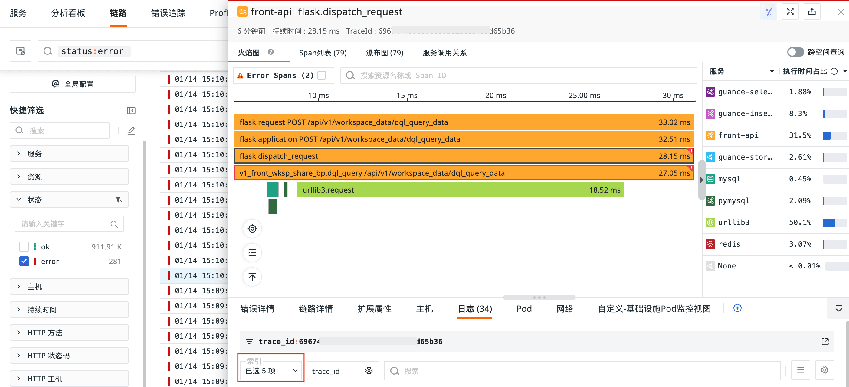 关联优化:在链路详情页查看关联日志时,系统会默认选中当前链路涉及的所有服务的全部相关索引,避免手动勾选的遗漏风险。