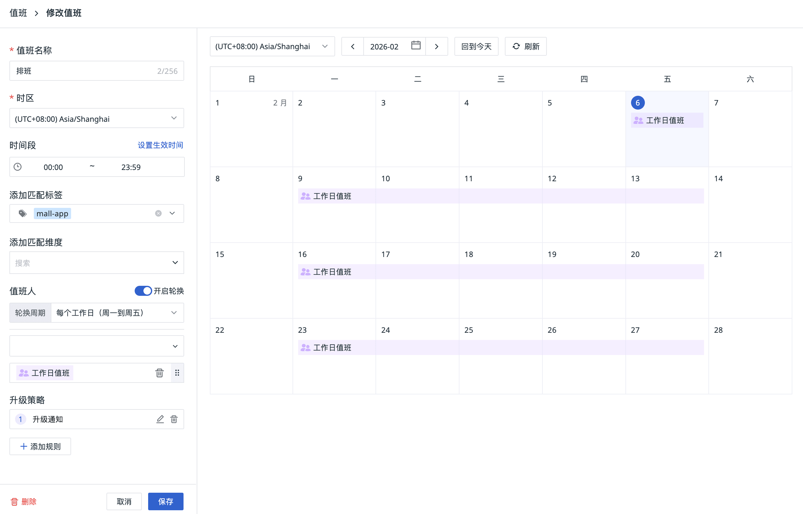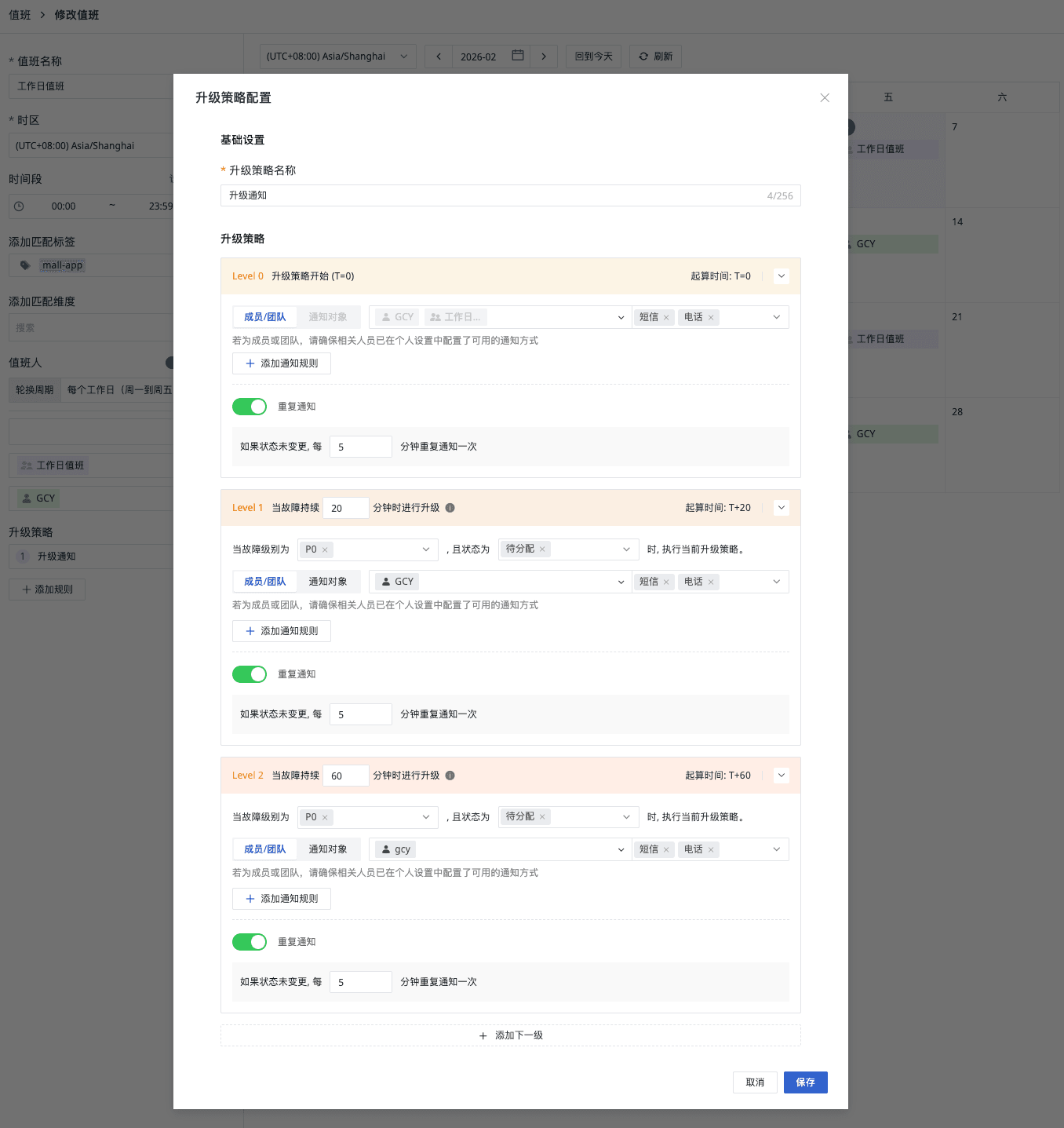 支持多团队轮换(工作日 A/B 团队,周末 C/D 团队)、标签匹配(DB 故障找 DBA)、时区设置(跨国团队协作),让值班体系真正落地。
