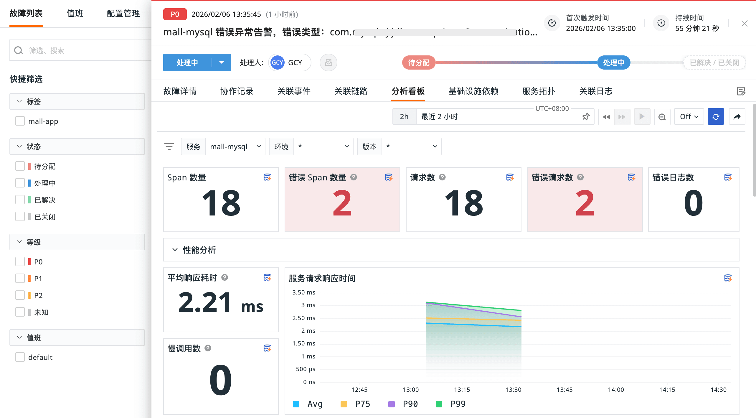- 查看上下文:故障(Incident)详情页自动展示最近 2 小时的关联数据