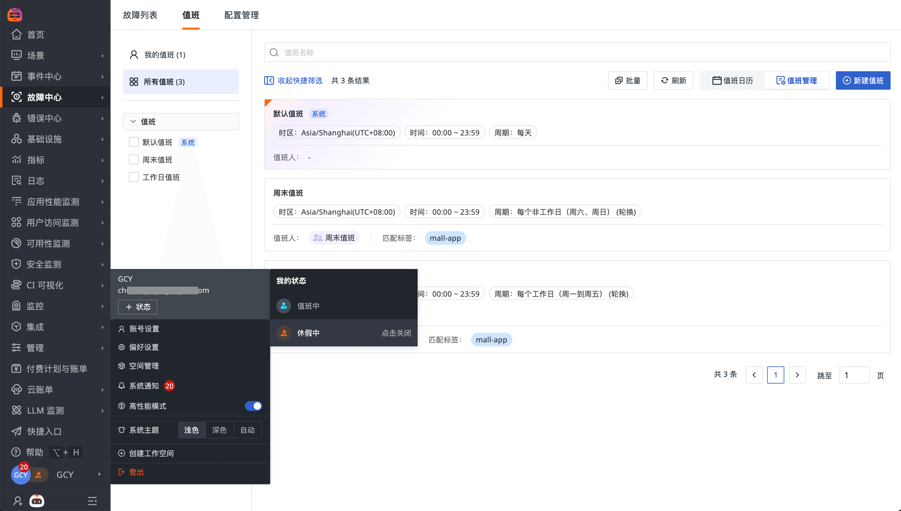 值班人员可在个人状态标记"休假中",系统将自动跳过,通知下一位值班人。避免"人在沙滩躺着还被告警吵醒"的情况。
