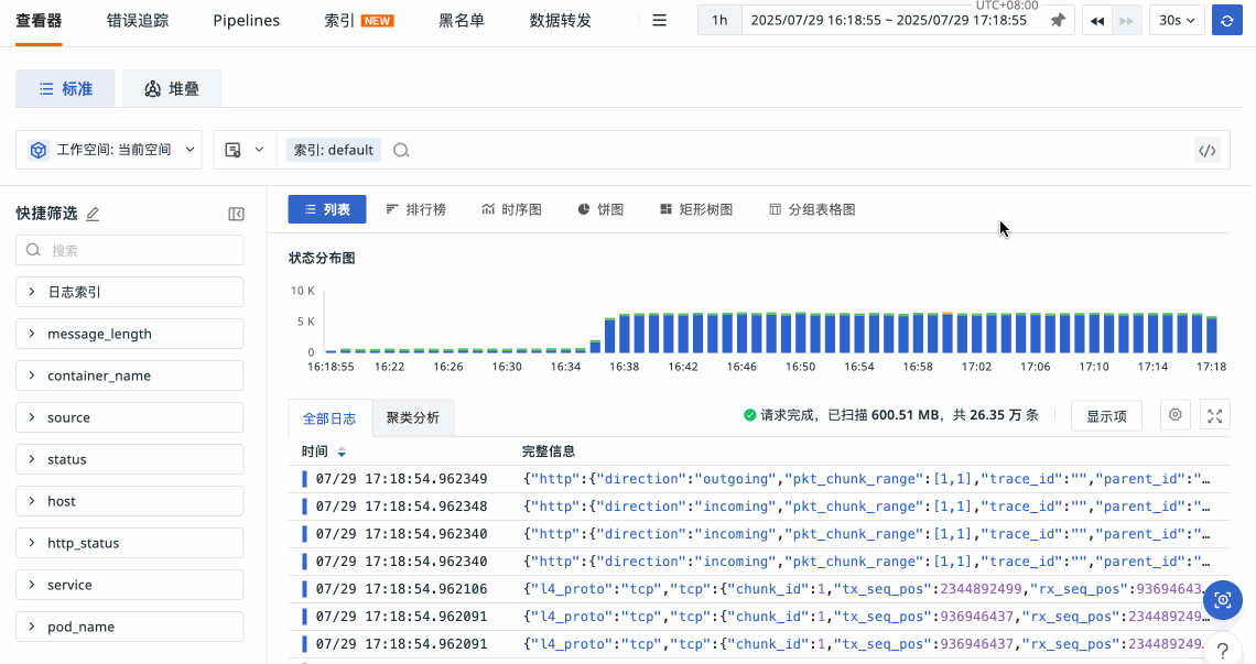 - 通过简单筛选条件(如 source 字段),即可在日志查看器中快速定位并查看 BPF 网络日志详情,如不同时间点的数据包流向,深入分析客户端与服务端的数据包交换过程。