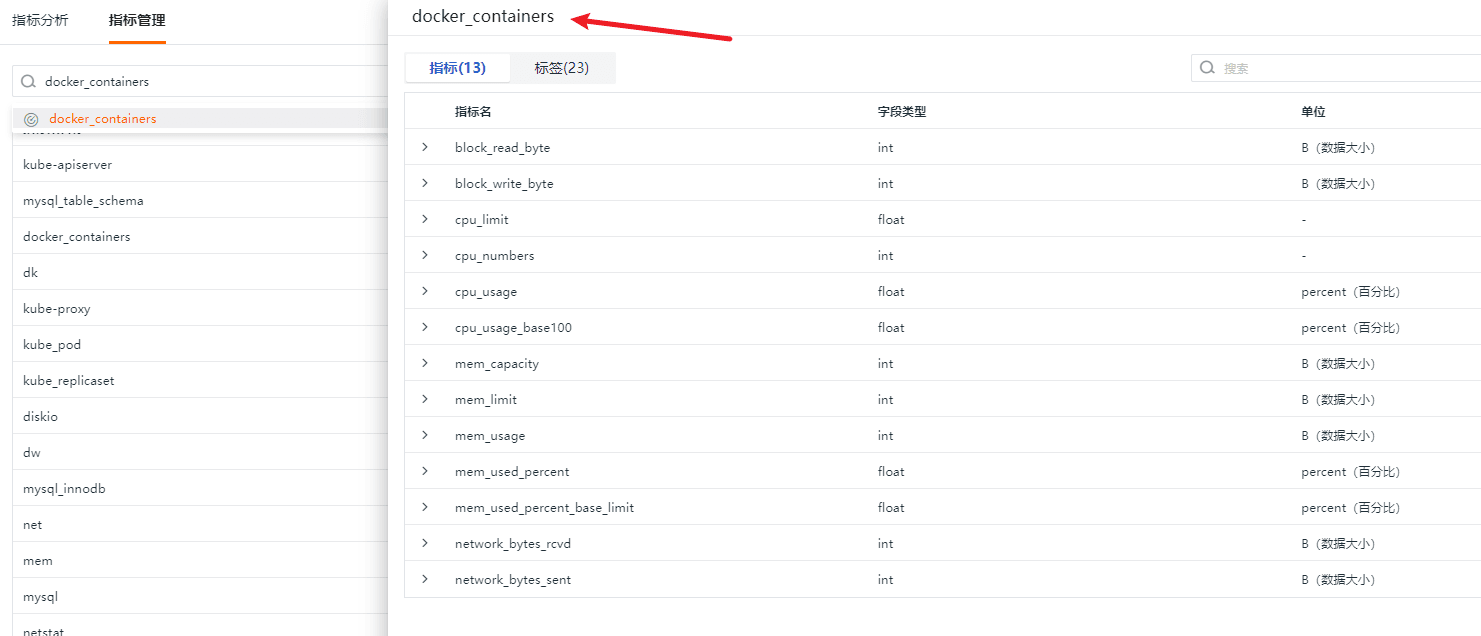 登录观测云->指标->指标管理,采集容器所有指标列表如下。