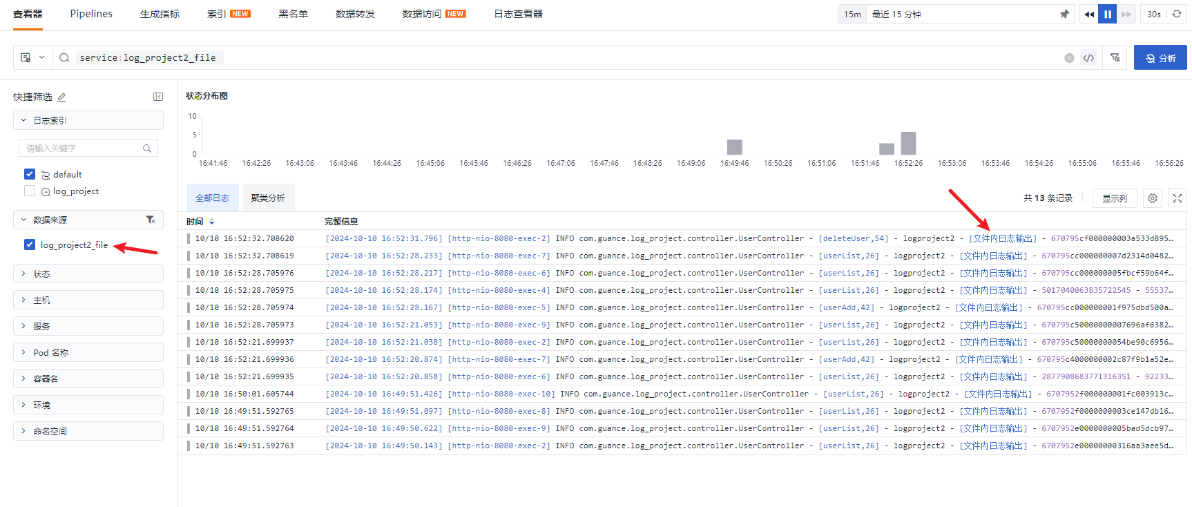 为了区分两种不同的日志,本示例控制台输出日志中会包含“控制台日志输出”字样,容器内文件日志中会包含“文件内日志输出”字样。