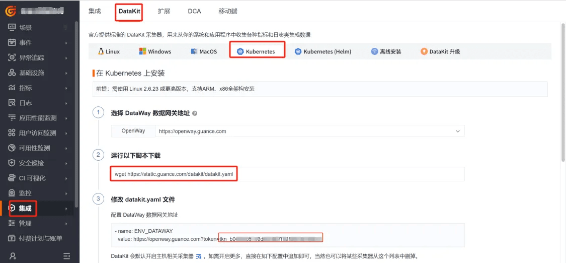 登录观测云控制台,点击「集成」 -「DataKit」 - 「Kubernetes」,下载 datakit.yaml ,拷贝第 3 步中的 token 。
