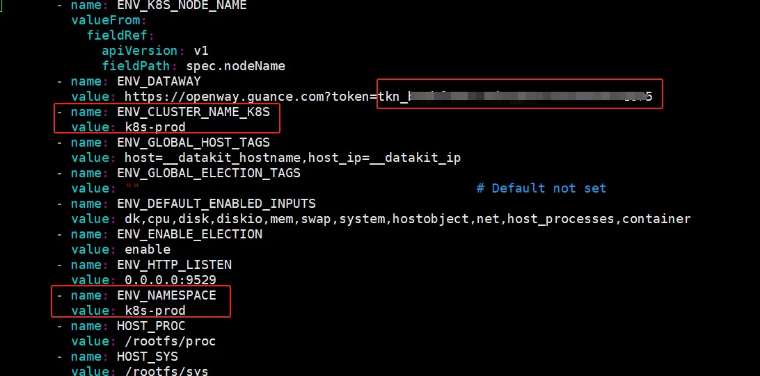 编辑 datakit.yaml ,把 token 粘贴到 ENV_DATAWAY 环境变量值中“token=”后面,设置环境变量 ENV_CLUSTER_NAME_K8S 的值并增加环境变量 ENV_NAMESPACE ,这两个环境变量的值一般和集群名称对应,一个工作空间集群名称要唯一。