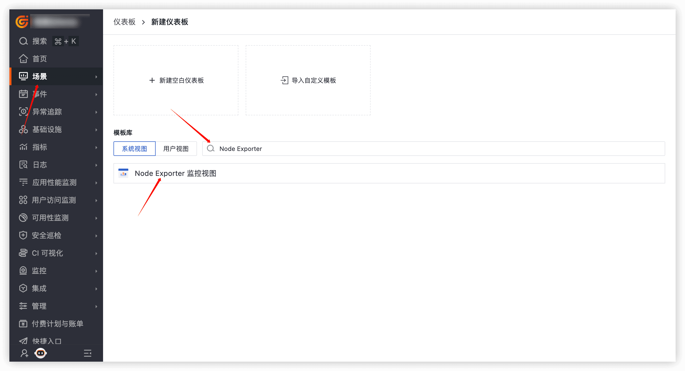 登录观测云控制台,点击「场景」 -「新建仪表板」,输入 “Node Exporter ”, 选择 “Node Exporter 监控视图”,点击 “确定” 即可添加内置视图: