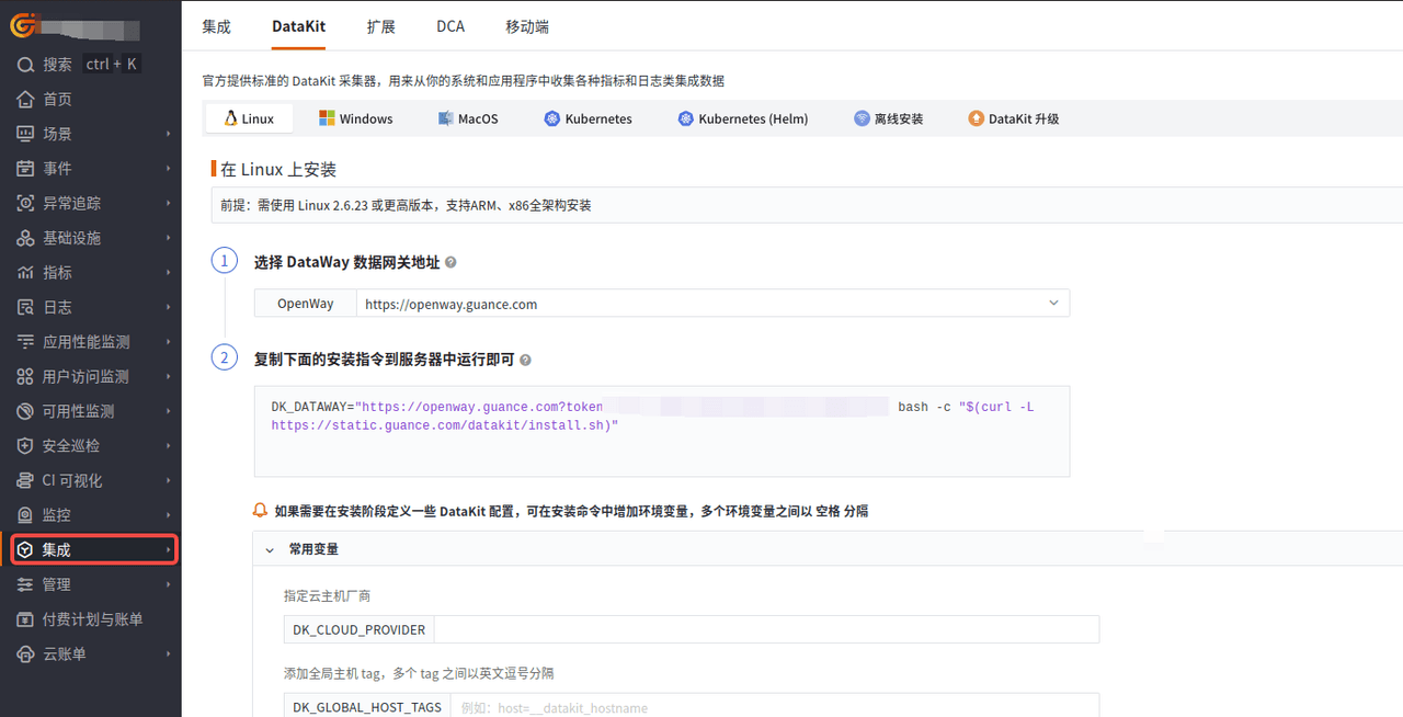 登录观测云控制台,在「集成」 - 「DataKit」选择对应安装方式,当前采用 Linux 主机部署 DataKit。