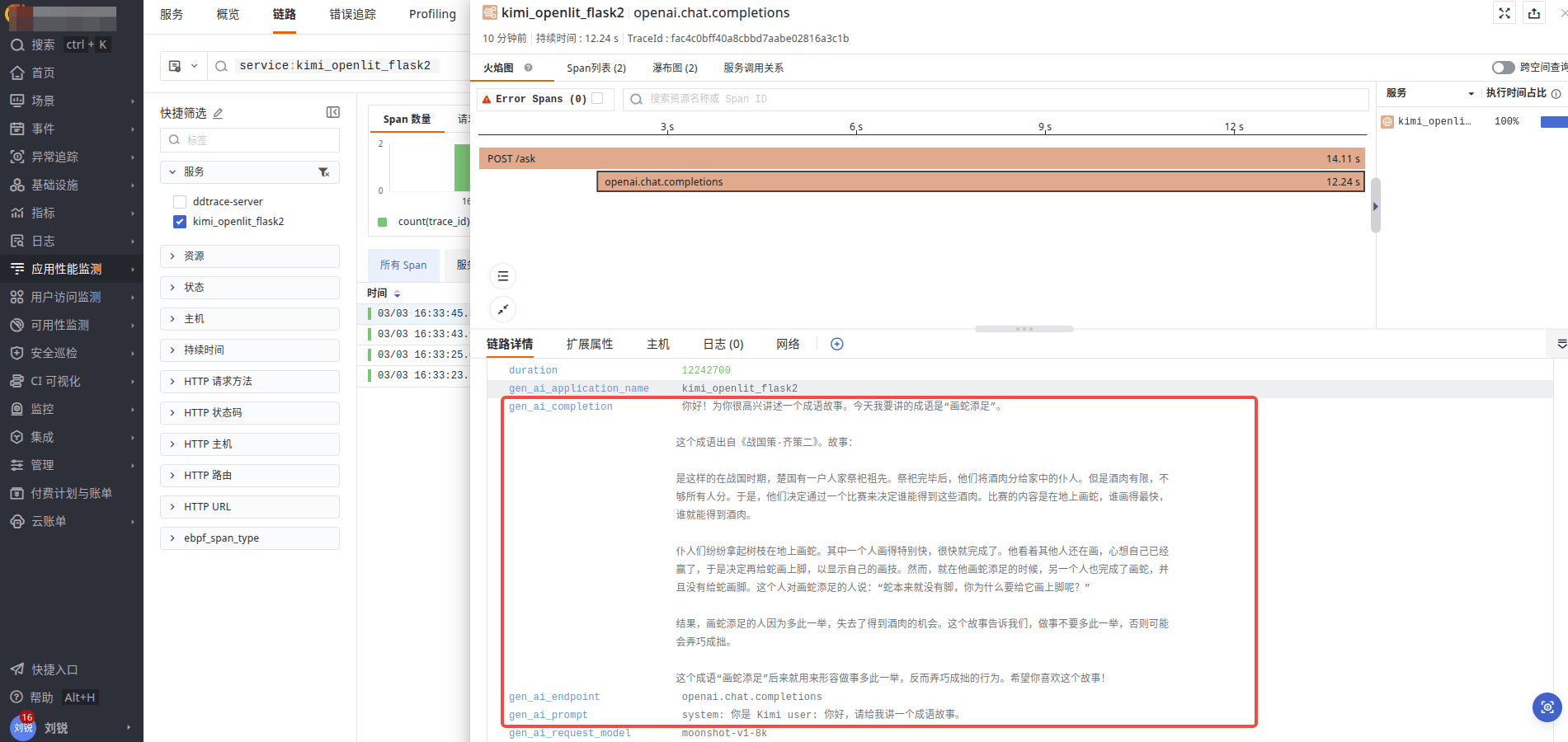为了更好地理解如何应用这些概念,让我们来看一个具体的案例。假设我们有一个基于 Python 的 LLM 应用程序。通过集成 OpenTelemetry SDK,我们可以轻松地为每个推理请求添加追踪上下文,并记录相关的性能指标和日志信息。然后,我们可以将这些数据发送到观测云进行存储和查询,通过构建场景模板进行实时监控。