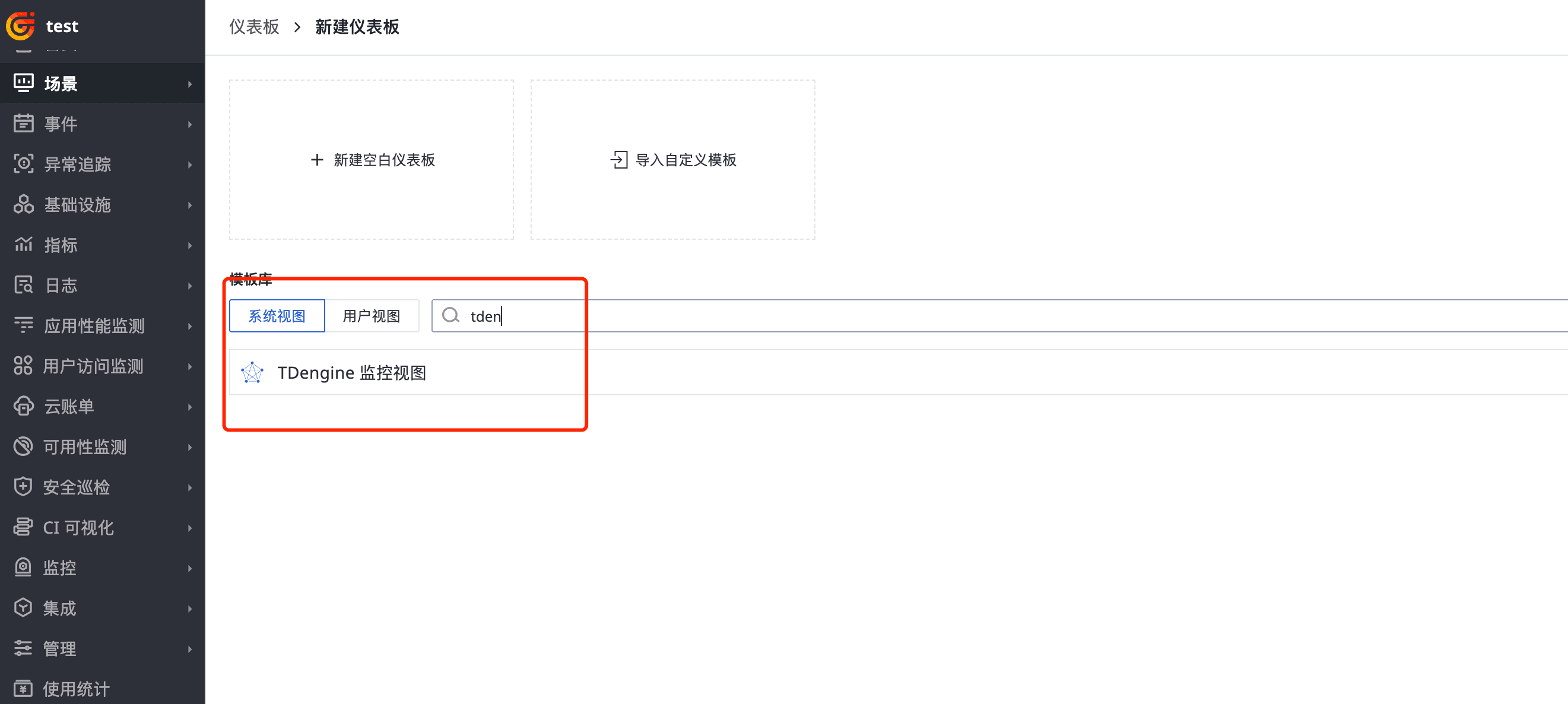 登录观测云控制台,点击「场景」 -「新建仪表板」,输入 “TDengine 监控视图”, 选择 “TDengine 监控视图”,点击 “确定” 即可添加视图。