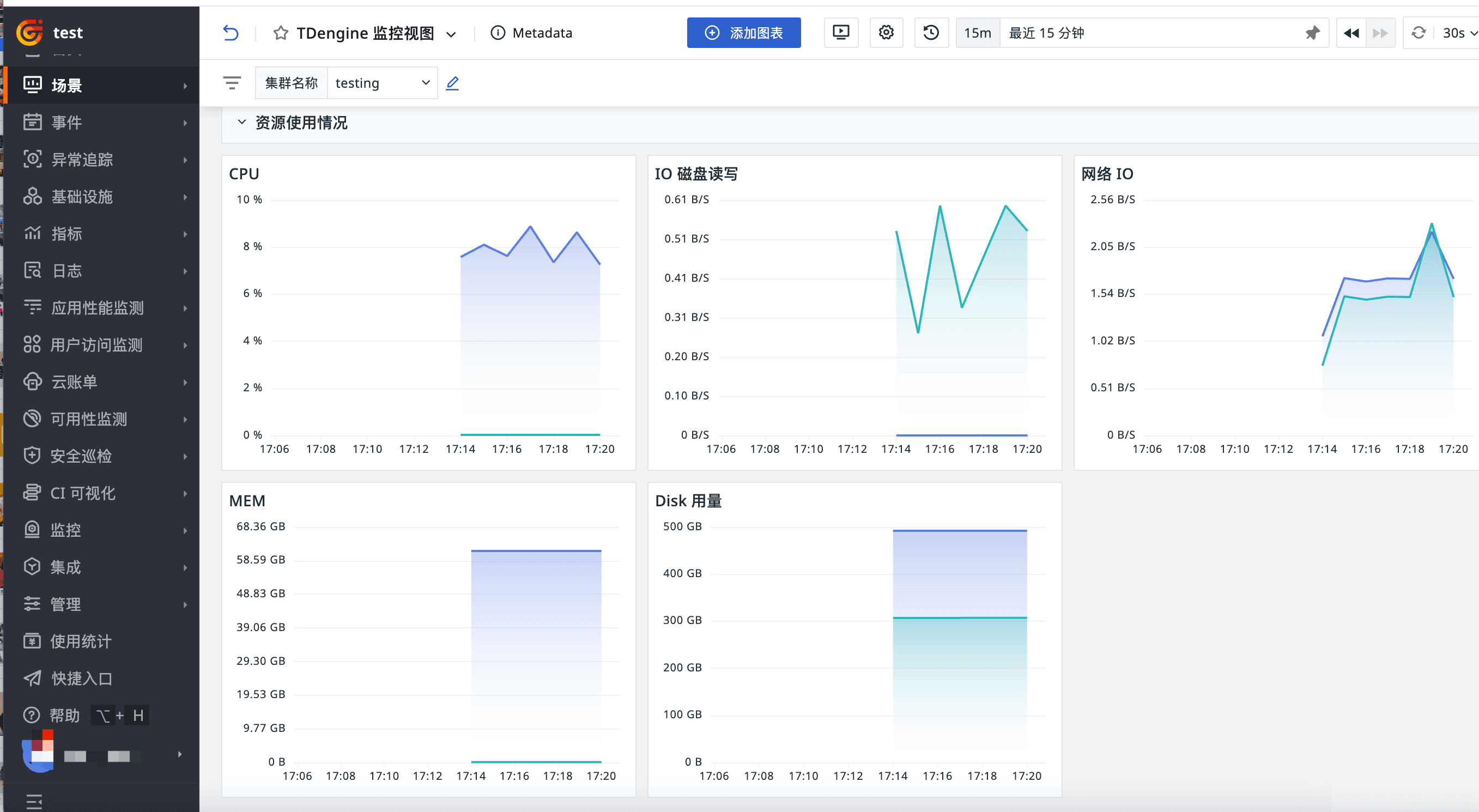 TDengine 提供了丰富的关键指标,涵盖客户端访问、资源使用、集群状态以及请求处理等多个方面。在观测云控制台中,用户可以便捷地新建“TDengine 监控视图”。同时,针对 TDengine 的重要指标,如内存使用率(mem_engine_percent)、实例存活情况(uptime、cpu_engine)、磁盘空间占用率(disk_percent)等,用户可以灵活设置告警规则。当这些指标达到特定阈值,例如内存使用率接近 100%、服务运行时间异常或磁盘空间占比过高时,系统将及时发出告警,助力运维人员保障 TDengine 的稳定高效运行。