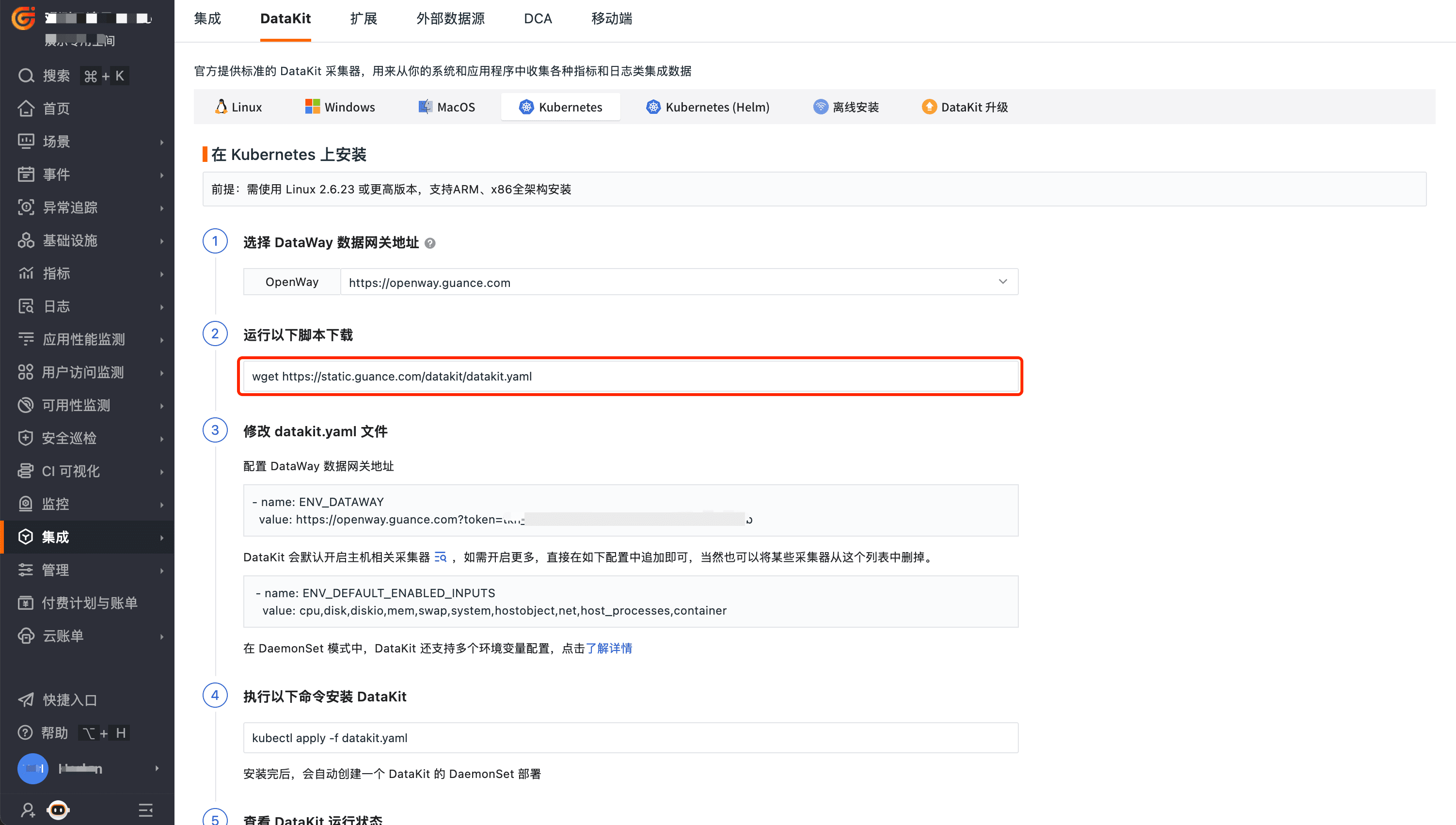 登录观测云控制台,点击「集成」 -「DataKit」 - 「Kubernetes」,下载 datakit.yaml,拷贝第 3 步中的 token。