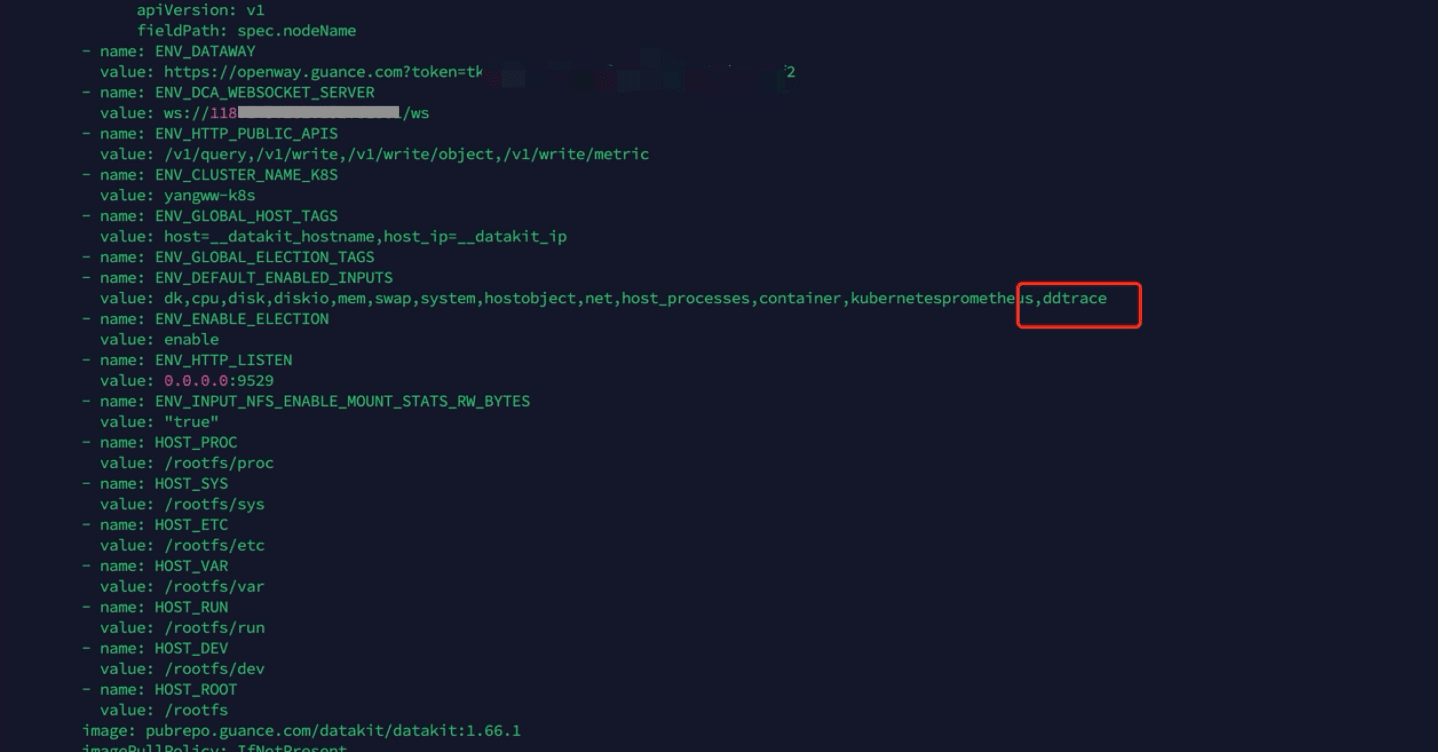 编辑 datakit.yaml ,把 token 粘贴到 ENV_DATAWAY 环境变量值中“token=”后面。