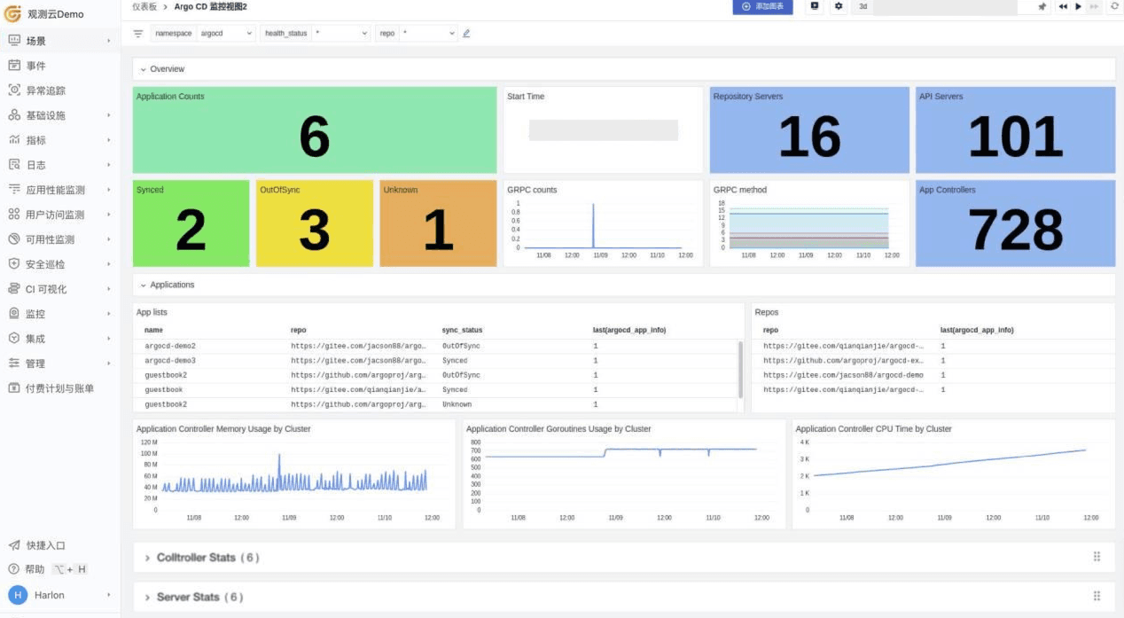 - Application Controller Metrics:ArgoCD 应用相关指标,例如应用数、ArgoCD 状态等。
