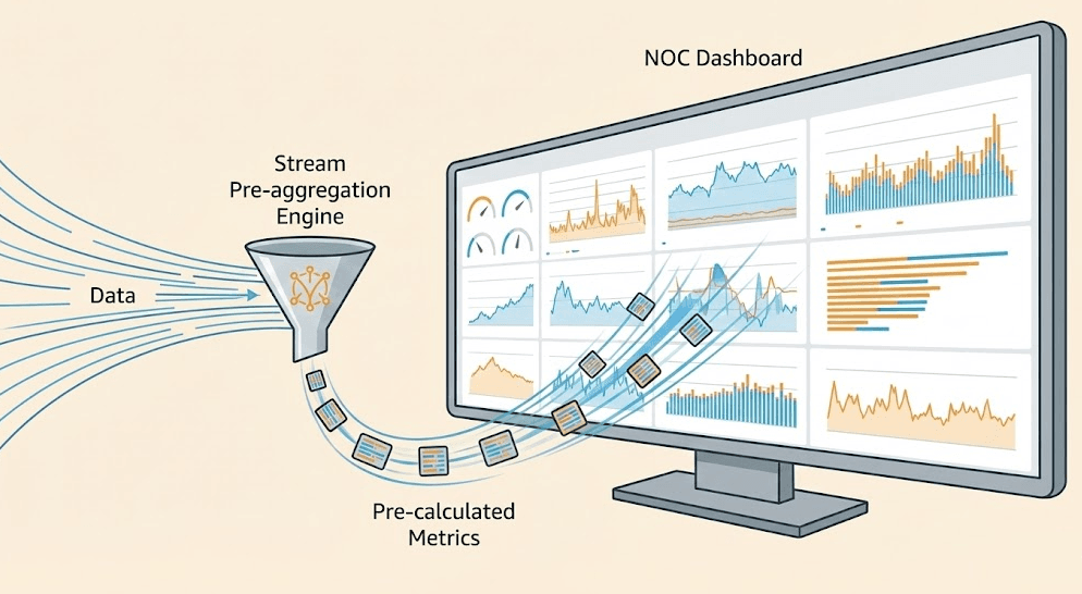 - 原理:GuanceDB 不再每次刷新都扫描原始日志。在数据摄取(Ingest)阶段,通过流式预聚合引擎(Pre-aggregation Engine)自动维护常用指标(如 Global_Error_Rate)。