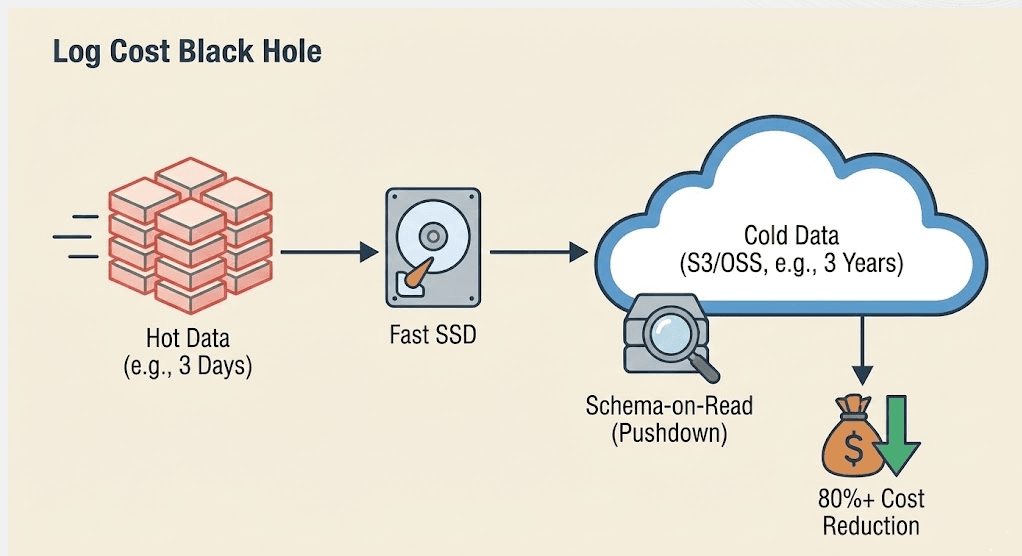 - 观测云 2026 解决方案: 冷热分层(Tiered Storage)+ Schema-on-Read(读时建模)。