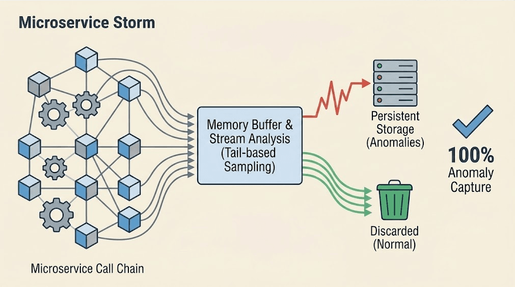 - 原理: 数据进入系统时不做丢弃,先在内存缓冲区暂存。通过流式引擎实时分析整条链路的尾部状态(是否报错、是否高延迟)。只有有问题或高价值的链路才会被持久化存储,正常的无用链路自动丢弃。