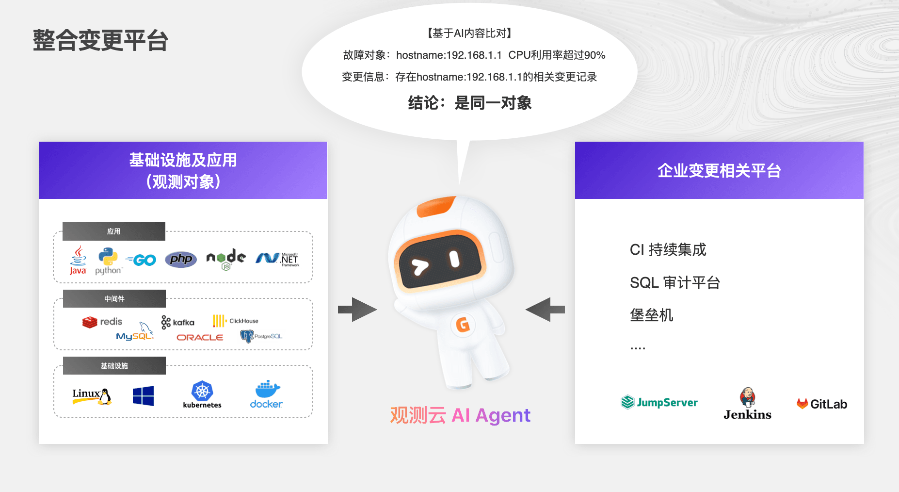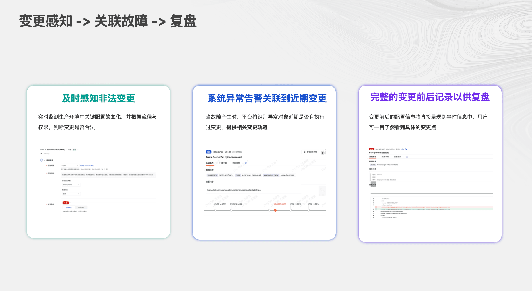 - 配置层:对接 Nacos、Apollo、Consul 等配置中心,实时记录配置项的 Diff。记录配置变了,还记录从什么变成了什么。
