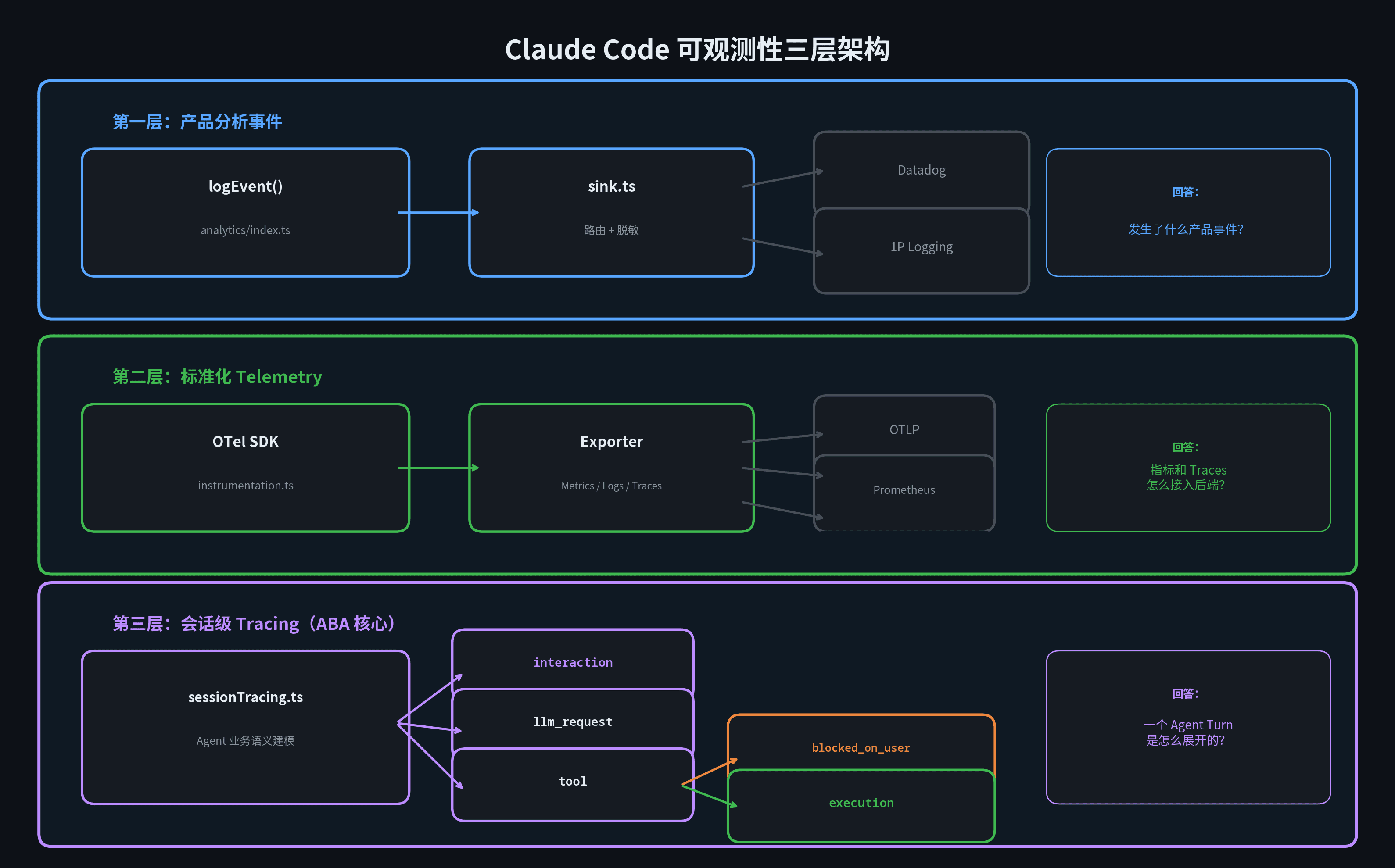 Claude Code 把可观测性拆成了三个独立层次,各管各的事: