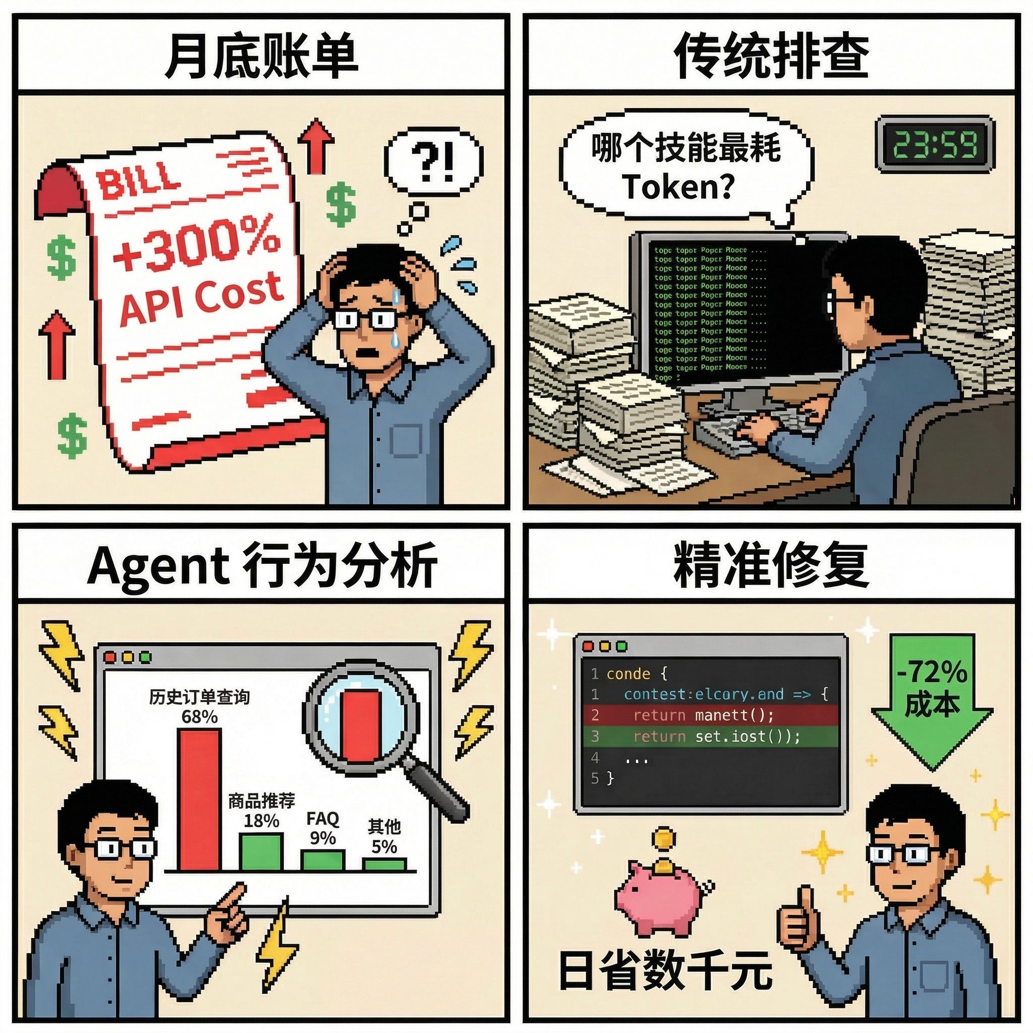 痛点:某企业上线了基于大模型的智能客服 Agent,月底账单暴涨 300%。研发团队翻遍了应用日志,只知道总 Token 消耗巨大,却无法回答:是哪个技能(Skill)最耗 Token?是哪个版本的 Prompt 导致了上下文膨胀?