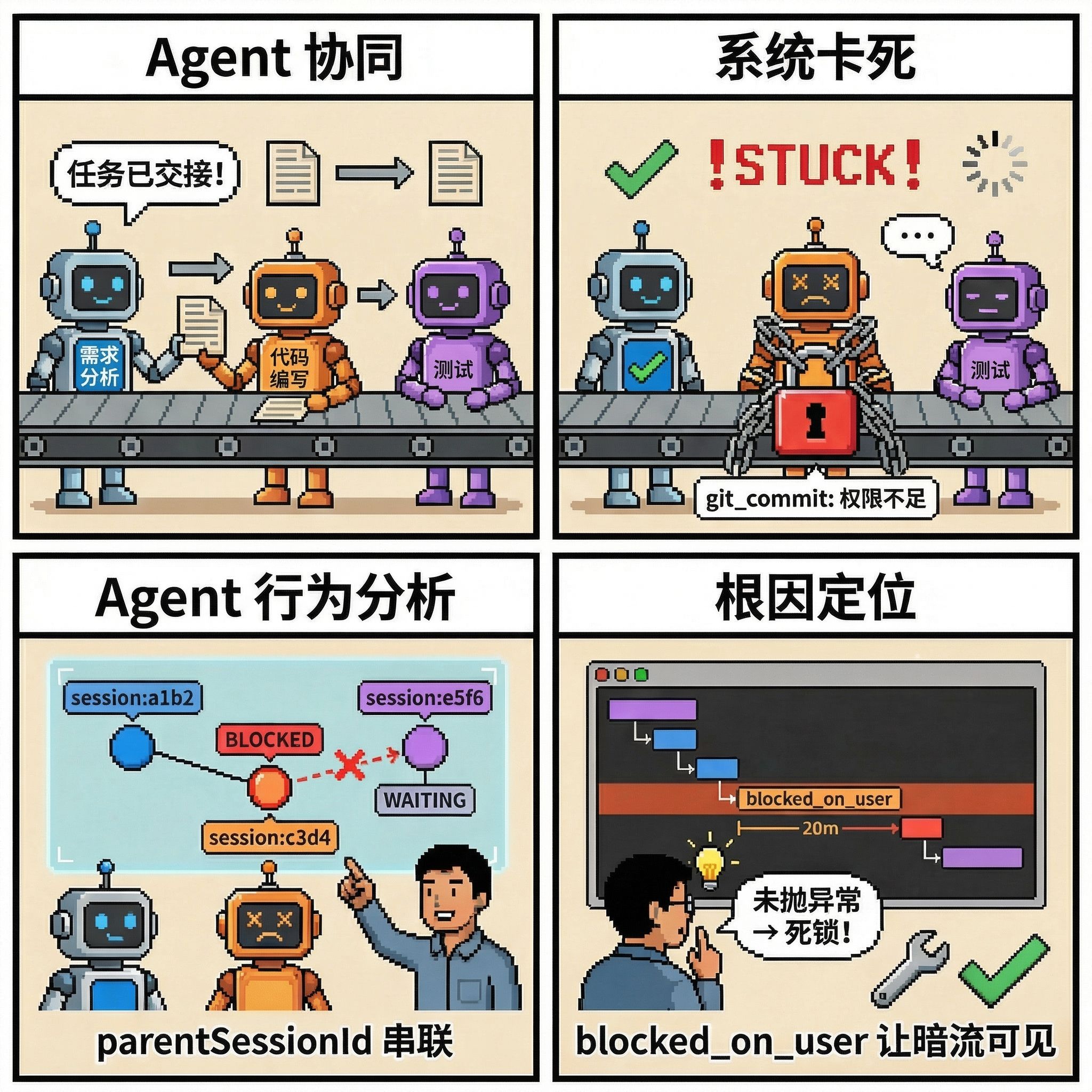 痛点:在复杂的研发场景中,企业部署了"需求分析 Agent"、"代码编写 Agent"和"测试 Agent"组成的 Swarm。最近系统频繁卡死,需求分析 Agent 认为任务已交接,测试 Agent 却在无限等待代码产出。