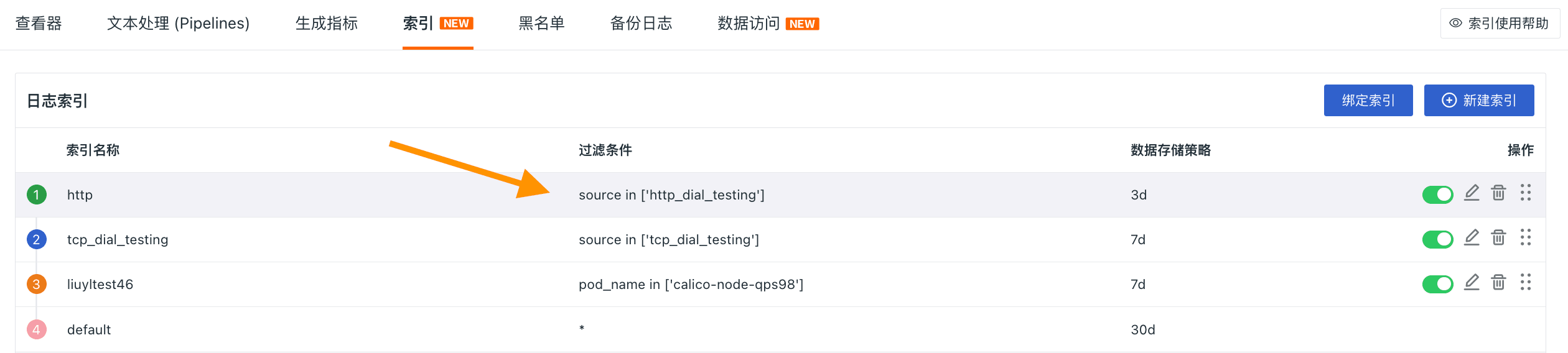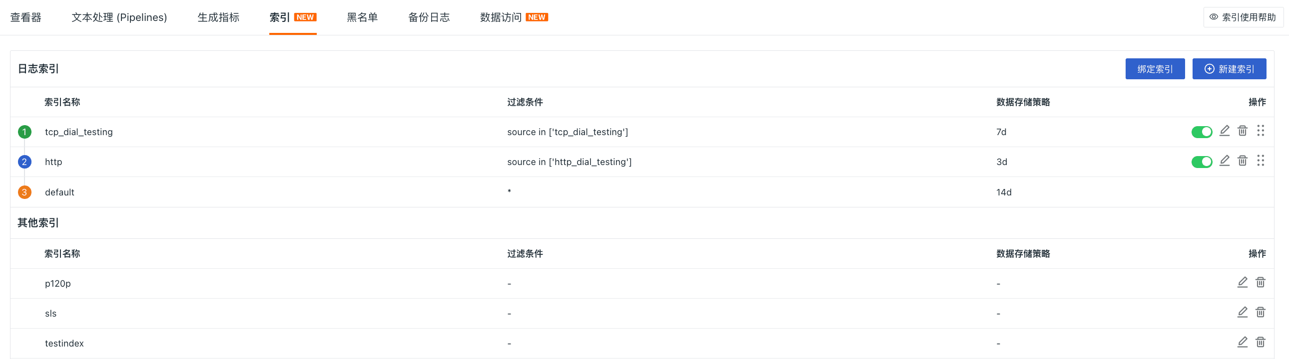当然,创建完成多个日志索引后,您可以在列表处统一管理,包括禁用/启用、编辑、拖拽等,帮助您提高工作效率。