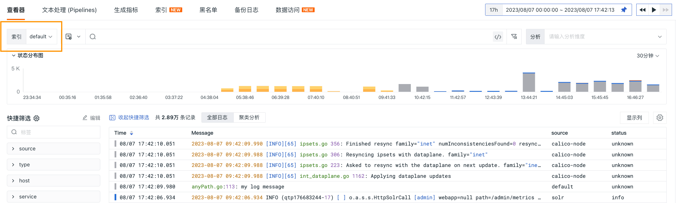 我们需要快速检索 source 为 worker-8 以及 source 为 etcd 的日志数据以快速定位相关关键日志信息,从而更好发现并解决系统的问题。因此我们创建两个名为 woker 和 rp60 的日志索引,并分设置了数据存储时间以便合理控制存储费用。