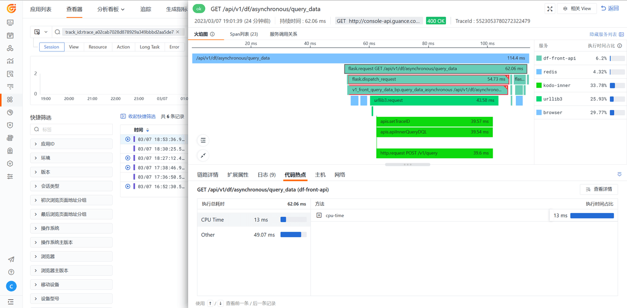 - (可选)若需分析代码性能瓶颈,则可以定位到 df-front-api 后端服务所在顶层 Span,查看「代码热点」,了解 Span 执行过程中的执行耗时占比及方法调用耗时分析