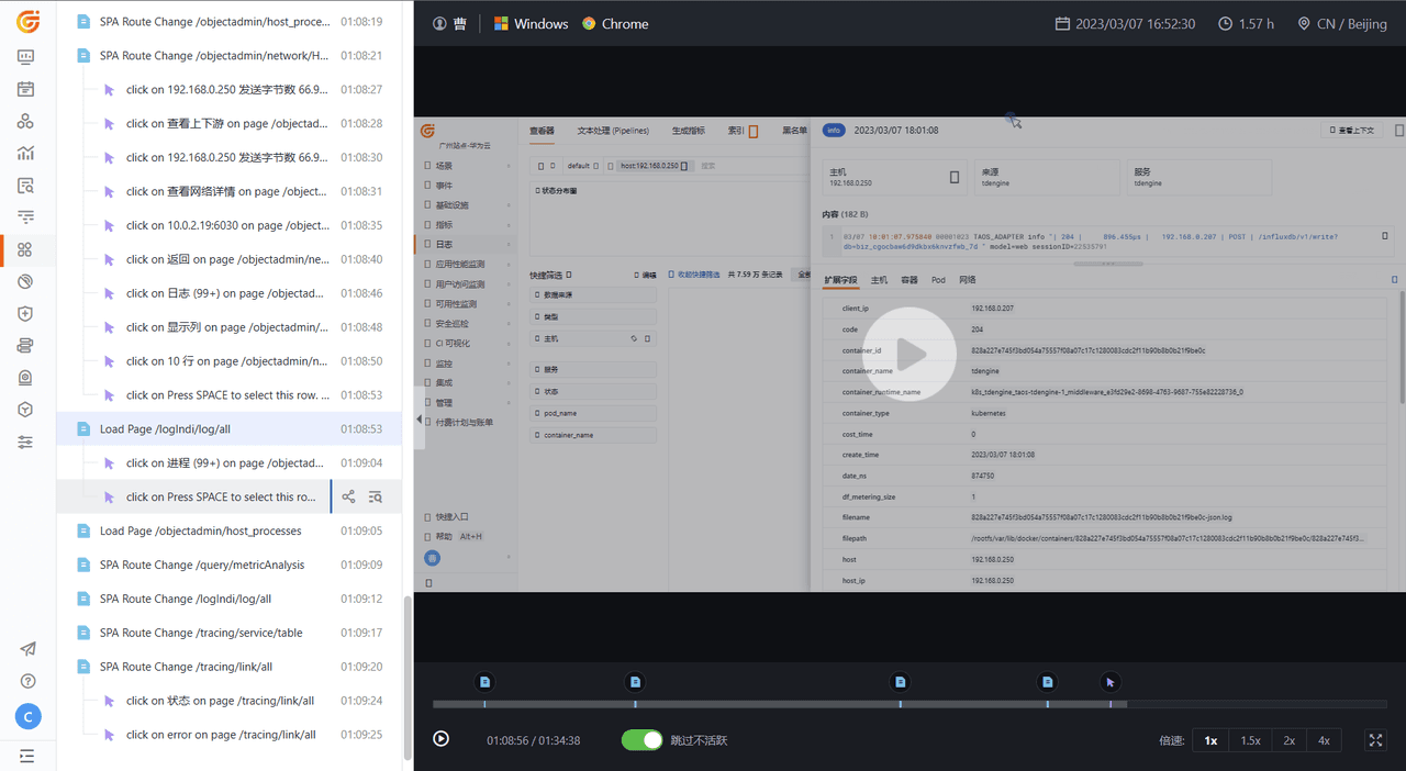 观测云同样提供会话重放功能,它会捕获单击、鼠标移动和页面滚动等内容,针对每一个会话生成视频记录。点击对应会话前面的【播放】按钮,更直观的了解用户的访问路径,定位发生异常的页面所在。