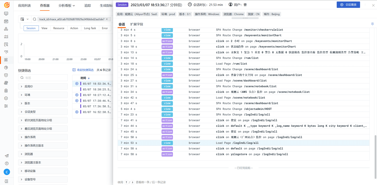 登录观测云,进入「用户访问监测」应用列表,选中「XXX」 Web 应用,进入查看器,根据上面生成的追踪 ID (track_id:实际 ID) 筛选查看用户实际访问轨迹数据。