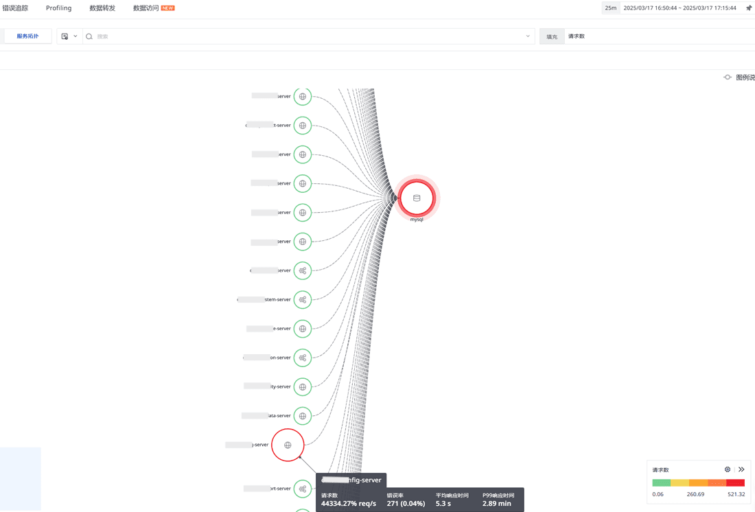 - 对 MySQL 调用最多的服务分析上下游调用情况,发现很多服务都会通过该配置服务调用 MySQL,建议考虑是否可以增加 MySQL 缓存优化
