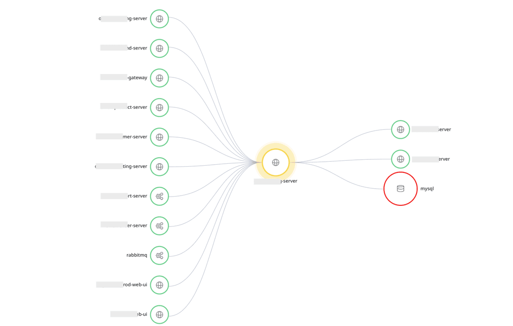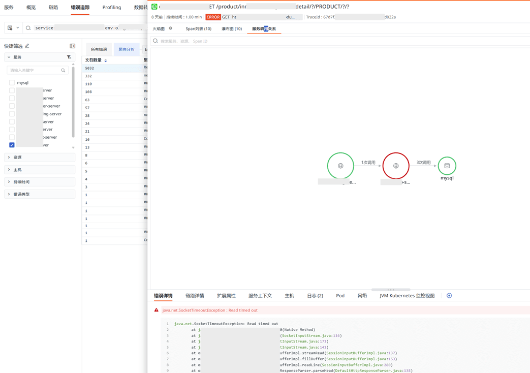 - 查看链路调用超时的拓扑图,有调 MySQL 数据库,在应用侧超时报错