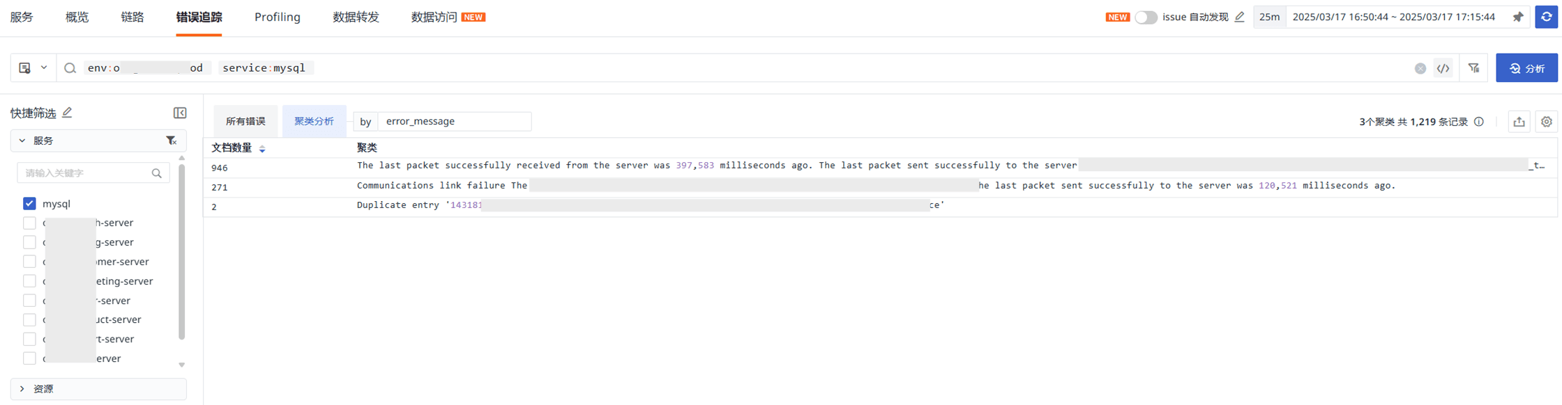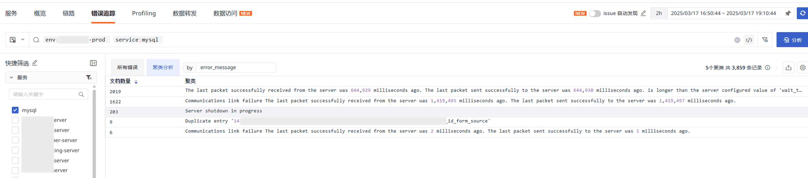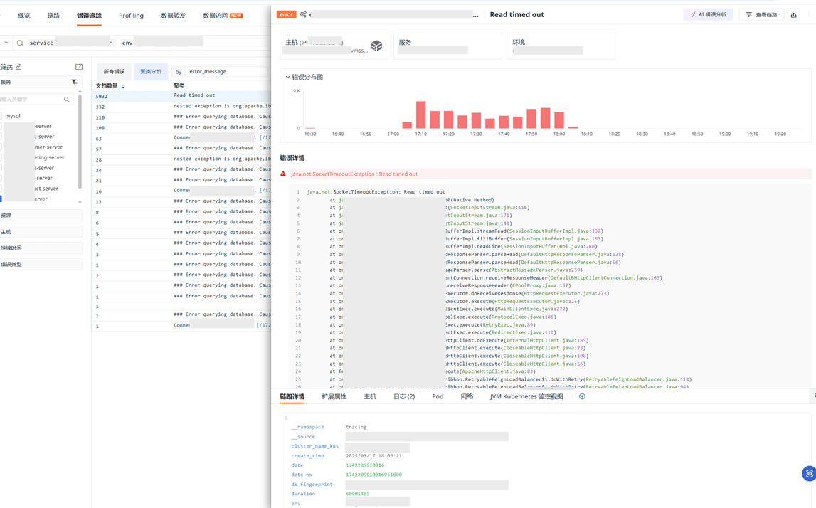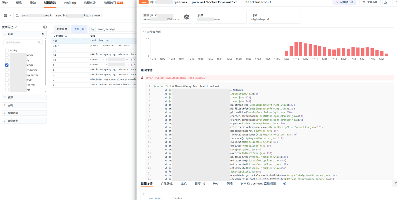 - 查看报错聚类分析,服务报错在该段时间,Read time out 报错最多
