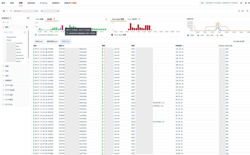 - 如图,通过观测云查看到,请求量增加,从 1 万 3 的请求量级增加到,20 万左右量级,并出现大量报错,请求超时,建议平时做好压测