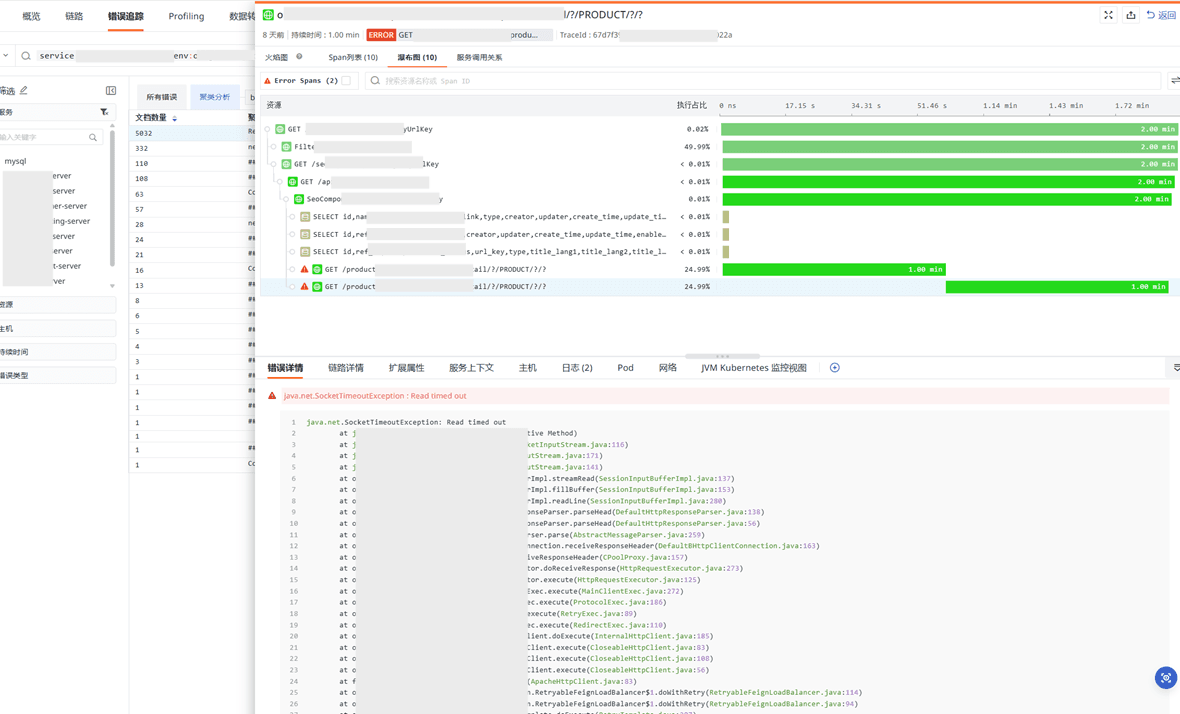 - 查看链路的瀑布图,有 1 分钟超时报错,建议检查超时设置