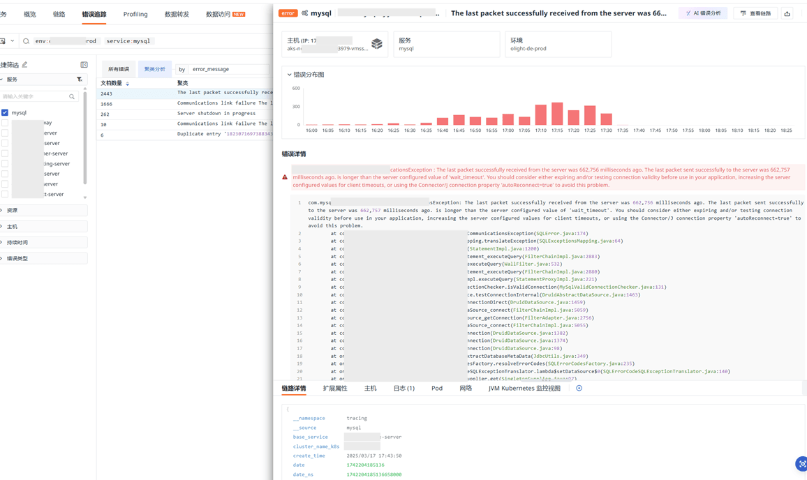 - 以上时间段可能有 MySQL 重启,筛选 17:00 左右数据,没有 server shutdown 的报错,但依然是通信超时异常