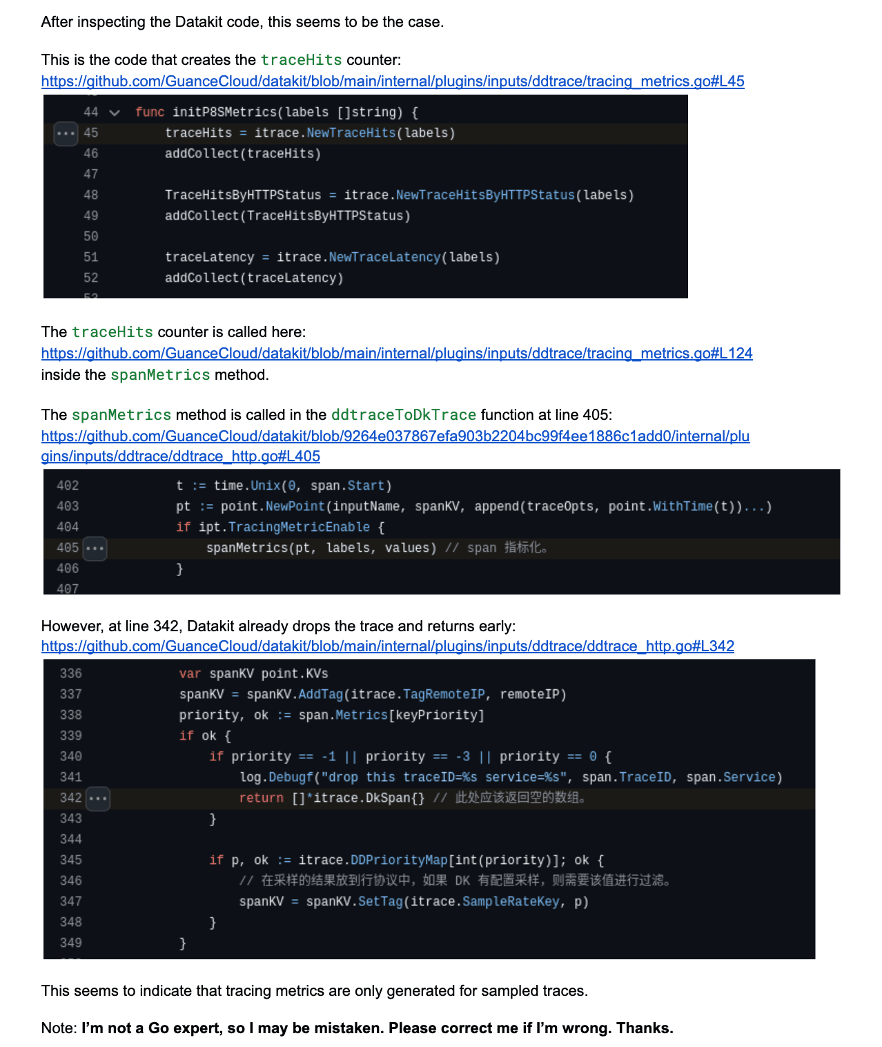 在一次对 DataKit 的使用反馈中,一位经验丰富的开发者发现:在某些链路追踪场景下,tracing metrics 与实际流量存在偏差。基于自身经验,他进一步深入代码分析了 DataKit 与 Datadog Agent 的差异。