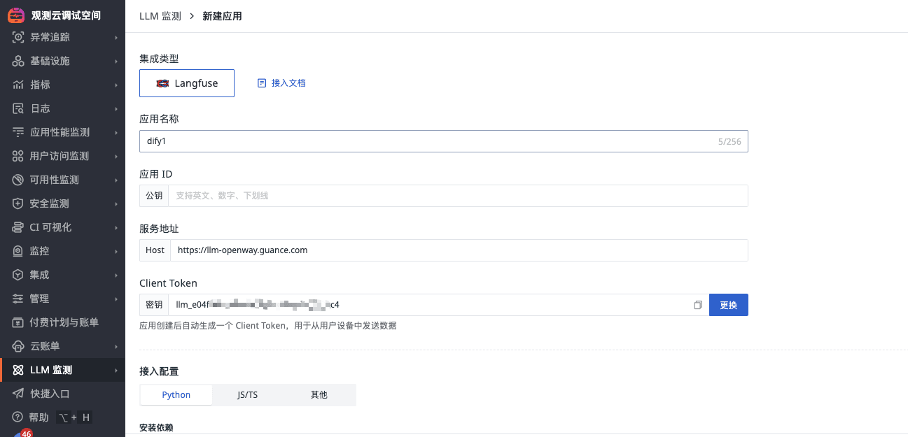 登录观测云控制台,点击「LLM 监测」 「新建应用」 输入应用名称,应用 ID,点击「创建」。