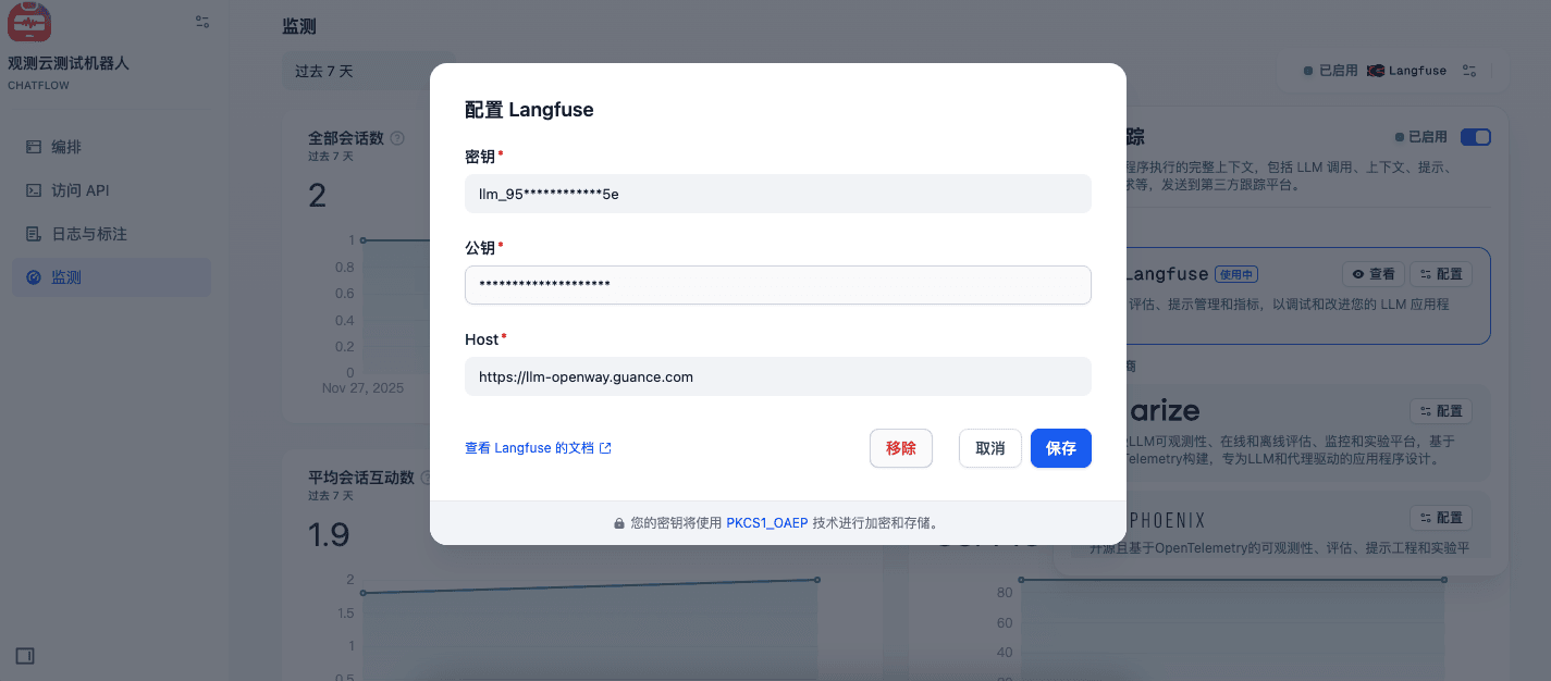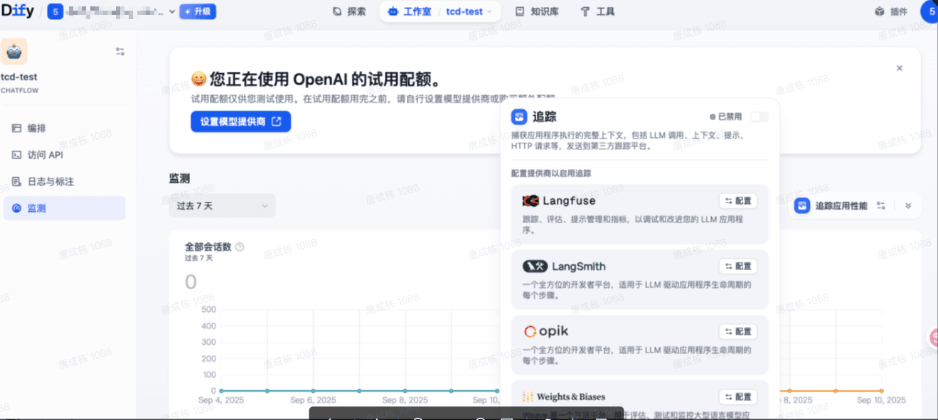 进入 Dify 后,选择「应用」-「监测」-「追踪应用性能」-「Langfuse」。