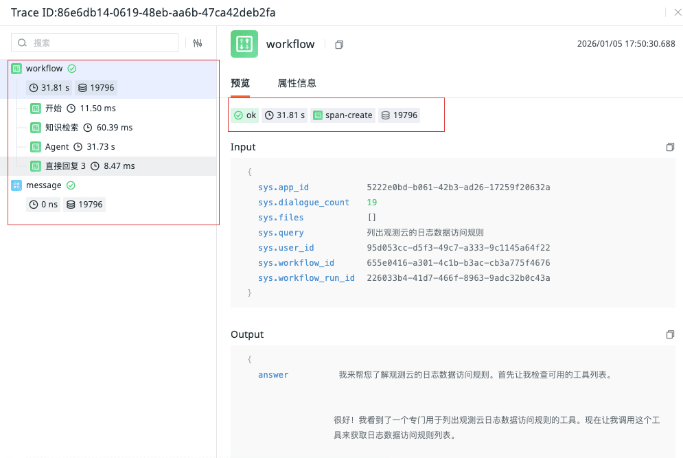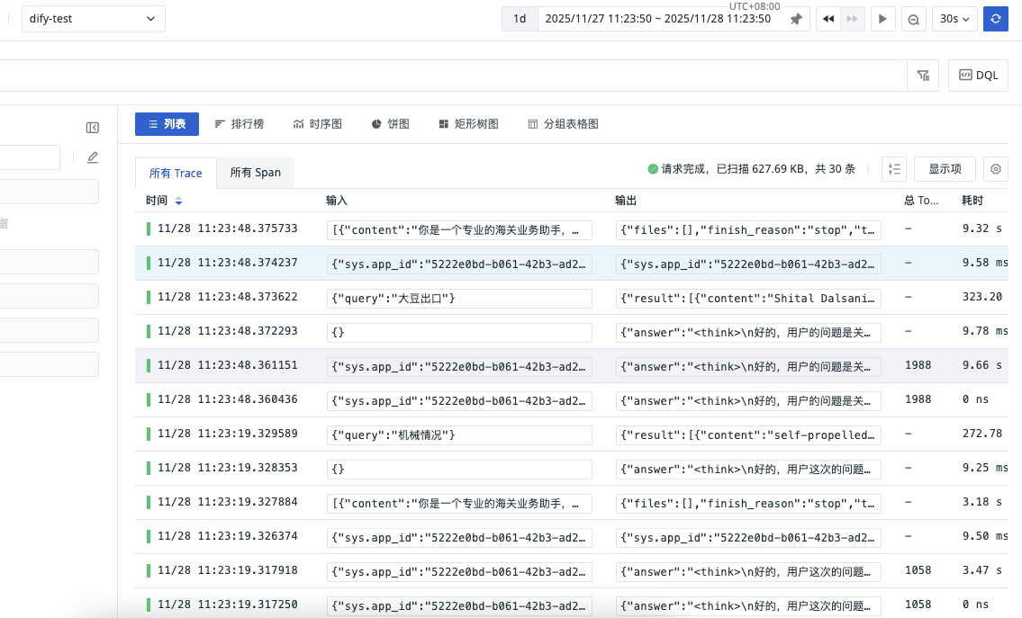 - 查看单次请求的完整链路:清晰查看用户提问从接收、处理(如数据库查询)、到调用 LLM 模型并返回答案的整个过程