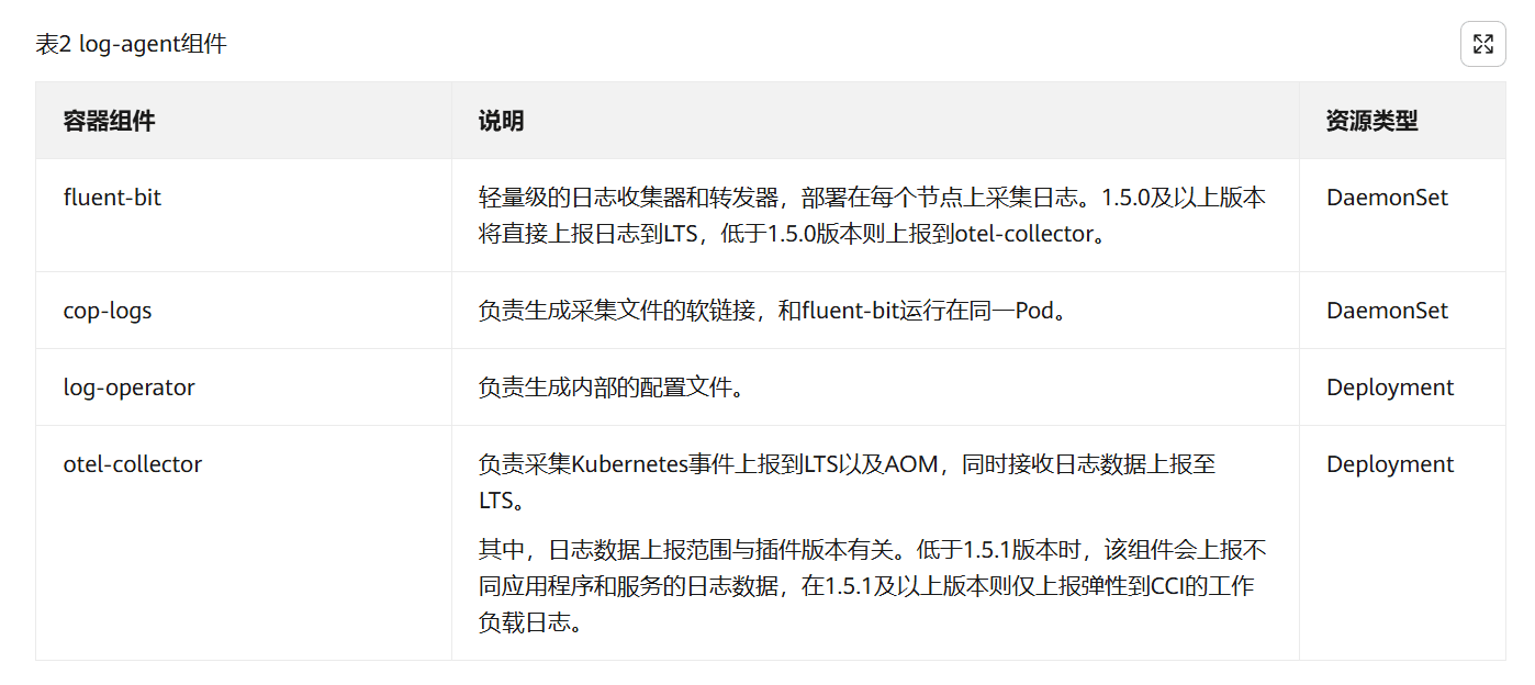 - 云原生日志采集插件:负责 CCE 日志和 CCI 日志的采集,插件版本要求 1.5.1 版本以上,插件说明如下。