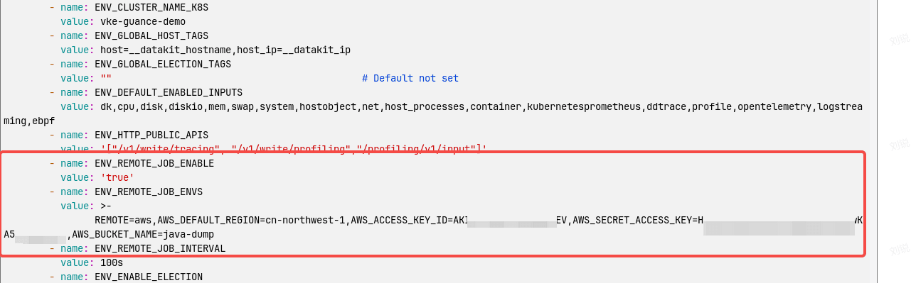 REMOTE=aws,AWS_DEFAULT_REGION=cn-northwest-1,AWS_ACCESS_KEY_ID=xxxxxxx,AWS_SECRET_ACCESS_KEY=xxxxxx,AWS_BUCKET_NAME=java-dump