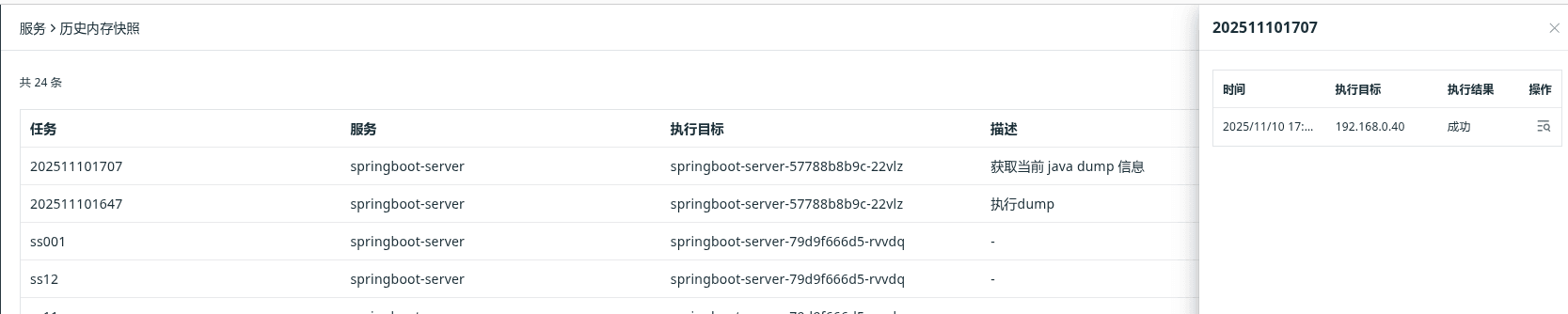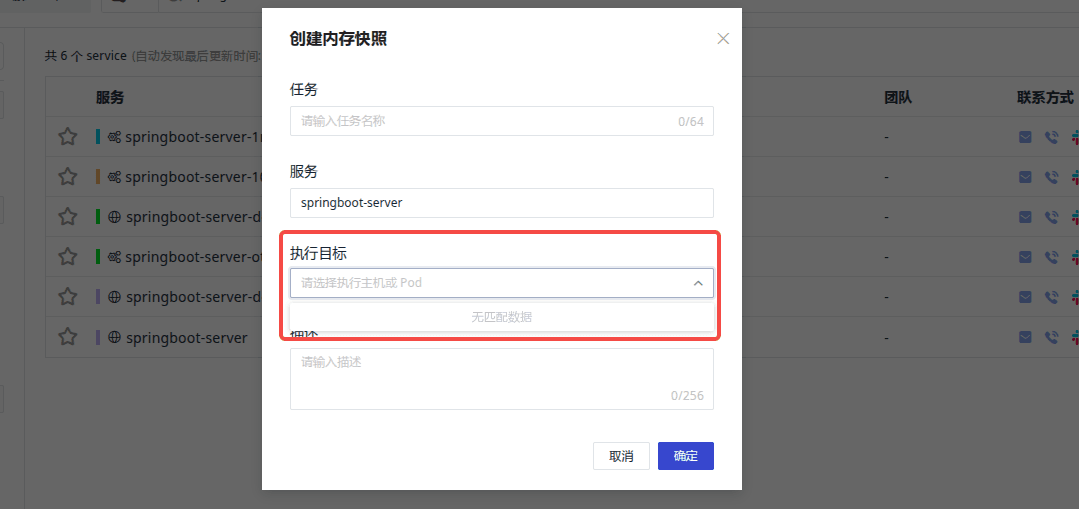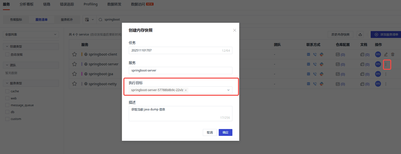 登录观测云平台,应用性能监测 - 服务 - 服务清单,选择对应的 java 服务,点击创建内存快照按钮进行创建。