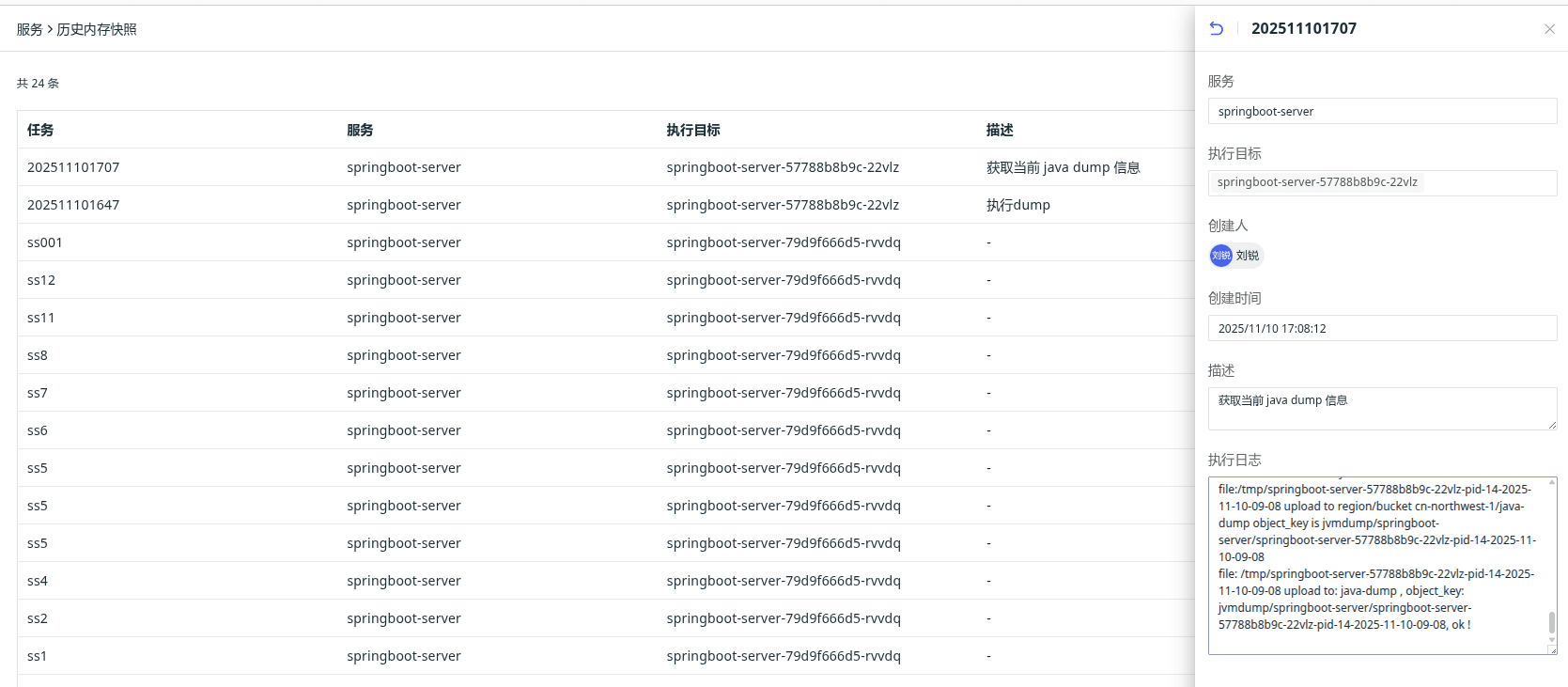 点击历史快照按钮,可以查看创建的历史记录及快照状态、日志信息。