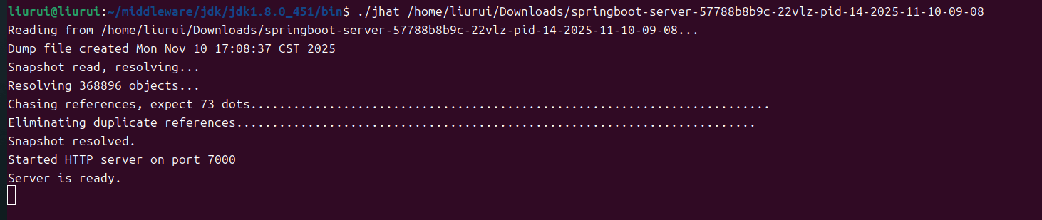 可以使用 jhat 命令解析 dump文件,并用浏览器直接查看,格式 jhat <dump-file-name> 。