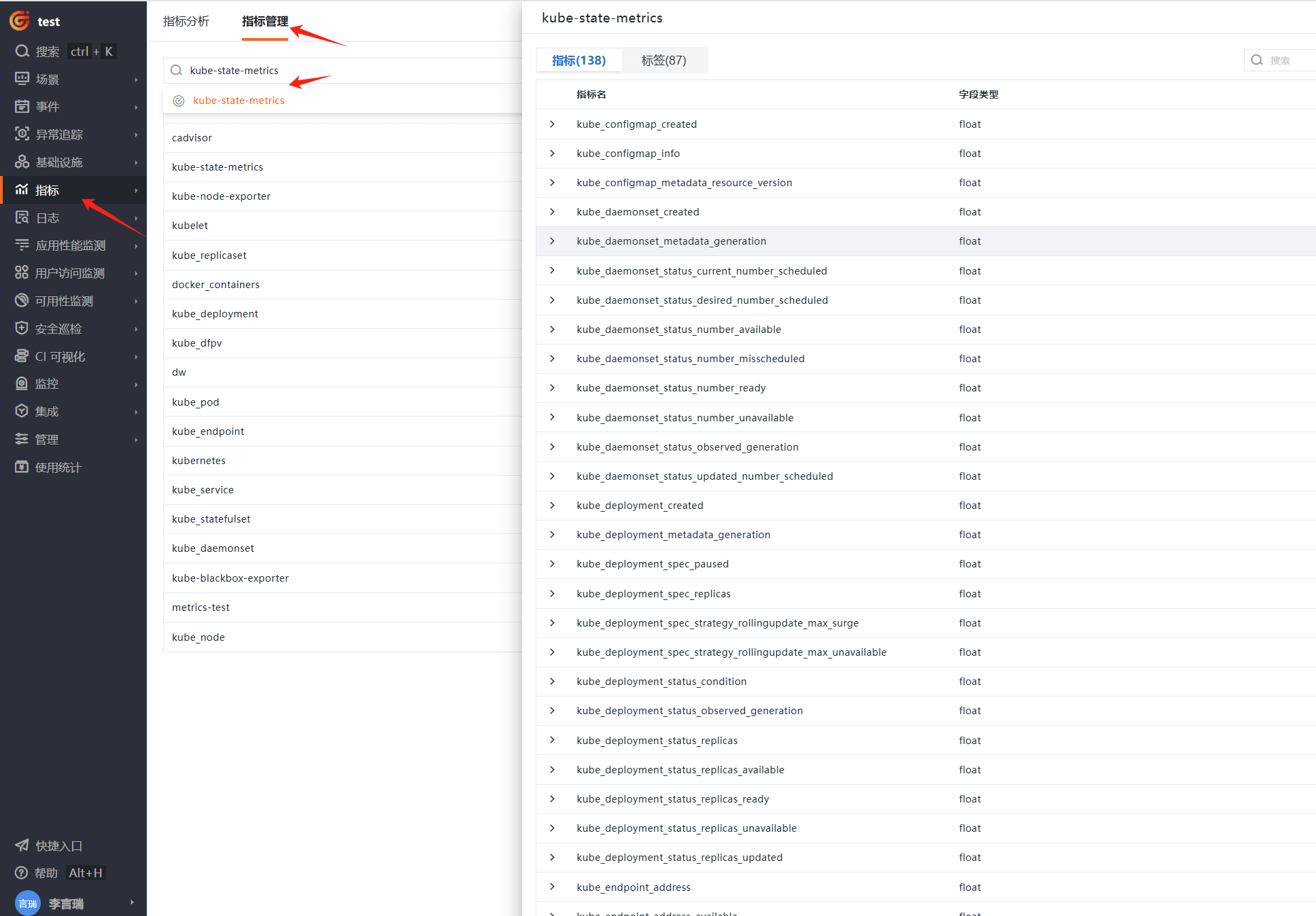 登录观测云控制台,点击「指标」 -「指标管理」,输入“kube-state-metrics”,就能查询采集到的指标。