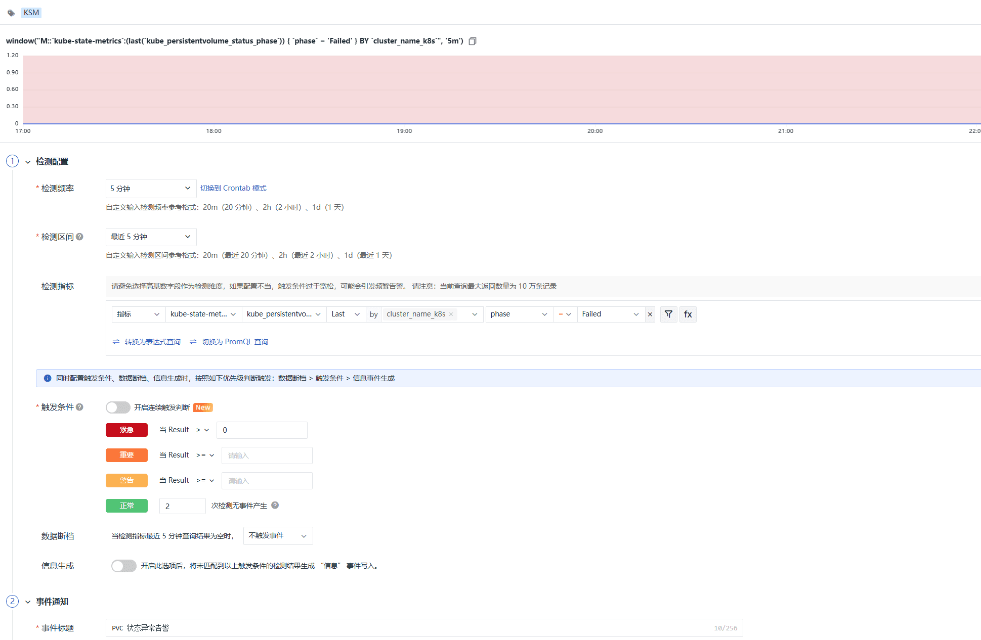 kube_persistentvolumeclaim_status_phase - 告警规则:当 PVC 长时间处于非 Bound 状态时触发告警。