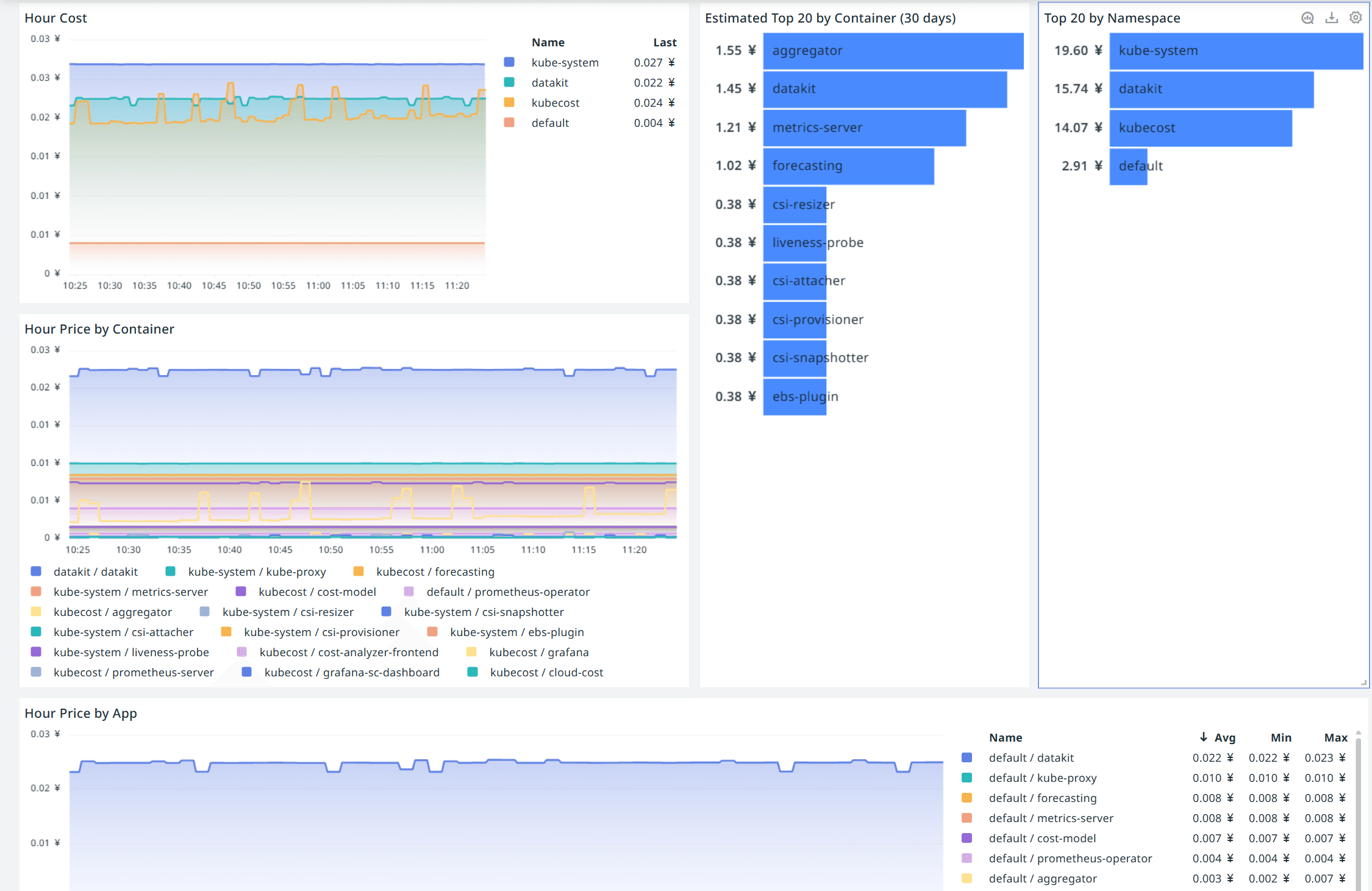 - 成本可视化:Kubecost 通过图表和仪表板的形式,为用户提供了一个清晰的成本概览。用户可以查看不同时间范围内的成本趋势,以及按命名空间、工作负载等维度细分的成本详情。
