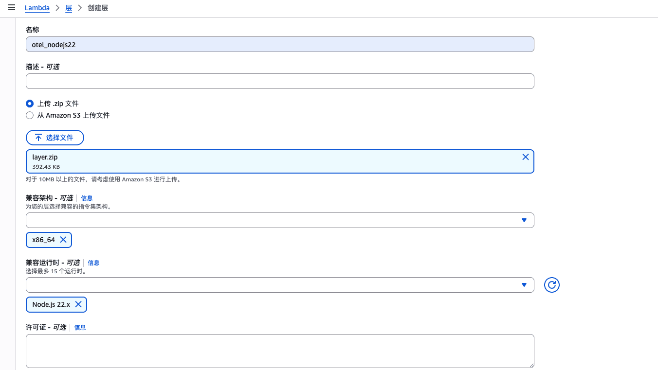 在 AWS 控制台 Lambda 进入「layer」,新建一个 Layer,选择上传 .zip 文件方式上传刚才生成的 layer.zip 文件,架构选择 x86、运行时选择 nodejs。创建好后复制 ARN 。